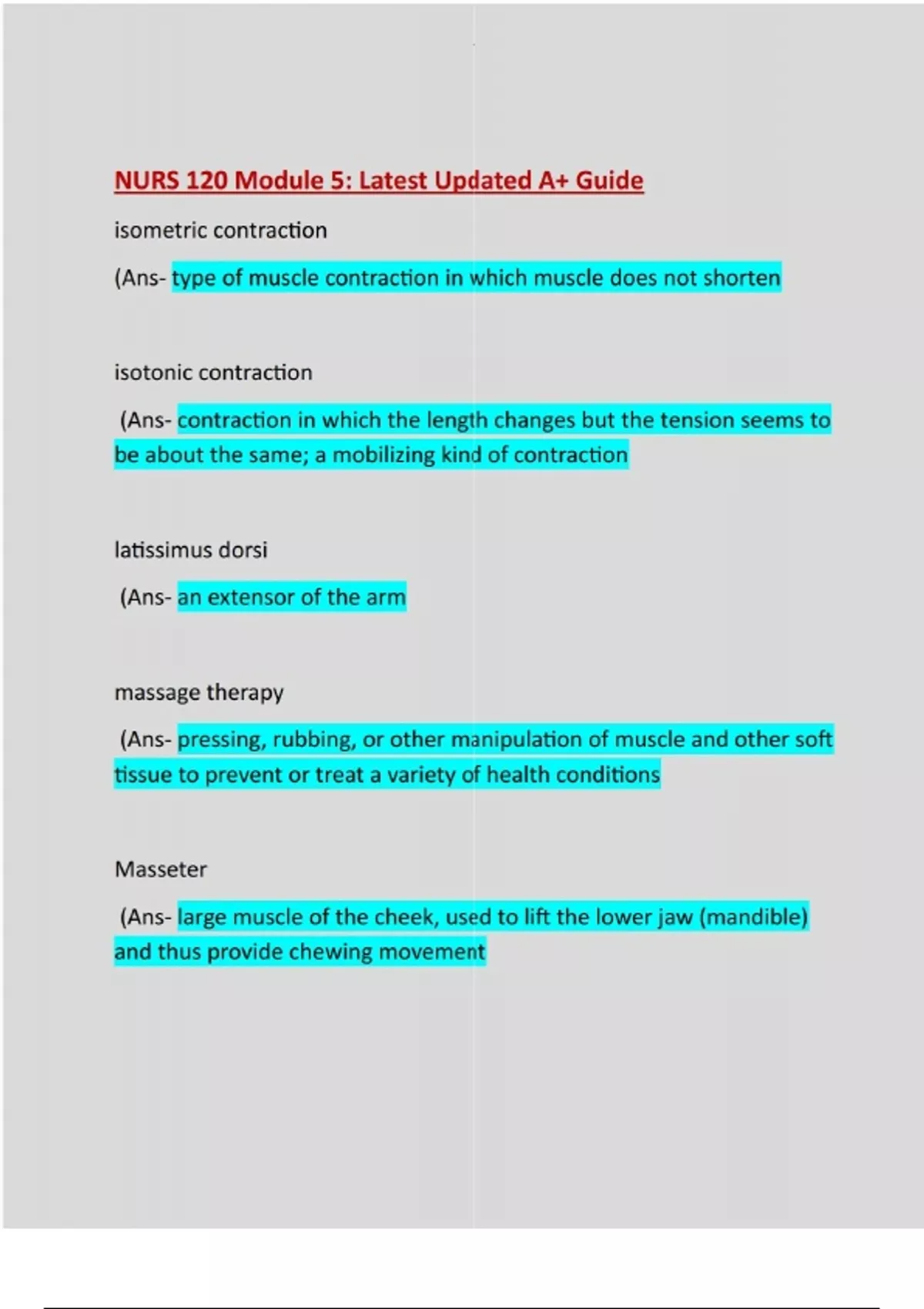 isometric contraction (Ans- type of muscle contraction in which muscle does not shorten isotonic contraction (Ans- contraction in which the length changes but the tension seems to be about the same; a mobilizing kind of contraction latissimus dorsi (Ans- an extensor of the arm massage therapy (Ans- pressing, rubbing, or other manipulation of muscle and other soft tissue to prevent or treat a variety of health conditions Masseter (Ans- large muscle of the cheek, used to lift the lower jaw (mandible) and thus provide chewing movementMastication (Ans- chewing motor neuron (Ans- transmits nerve impulses from the brain and spinal cord to muscles and glandular epithelial tissues motor unit (Ans- a single motor neuron with the muscle cells it innervates muscle fiber (Ans- any of the specialized contractile cells of muscle tissue muscle strain (Ans- overstretching or tearing skeletal muscle fibers resulting from overexertion or trauma muscle tone (Ans- the tension of muscle or tonic contraction; characteristic of muscle of a normal individual who is awakeMyofilament (Ans- any of the ultramicroscopic threadlike protein structures found in cylindrical groupings within each muscle fiber and involved in muscle contraction Myoglobin (Ans- large protein molecule in the cytoplasm of muscle cells that attracts oxygen and holds it temporarily Myosin (Ans- contractile protein found in the thick filaments of skeletal muscle neuromuscular junction (NMJ) (Ans- the point of contact between the nerve endings and muscle fibers