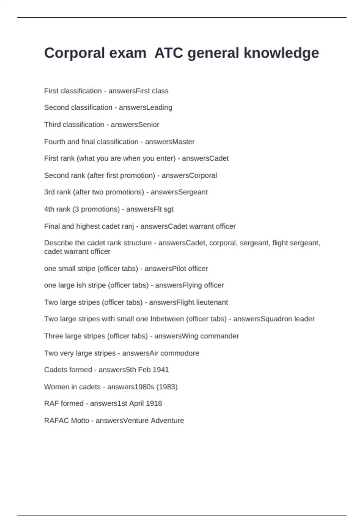 Describe the cadet rank structure - answersCadet, corporal, sergeant, flight sergeant,