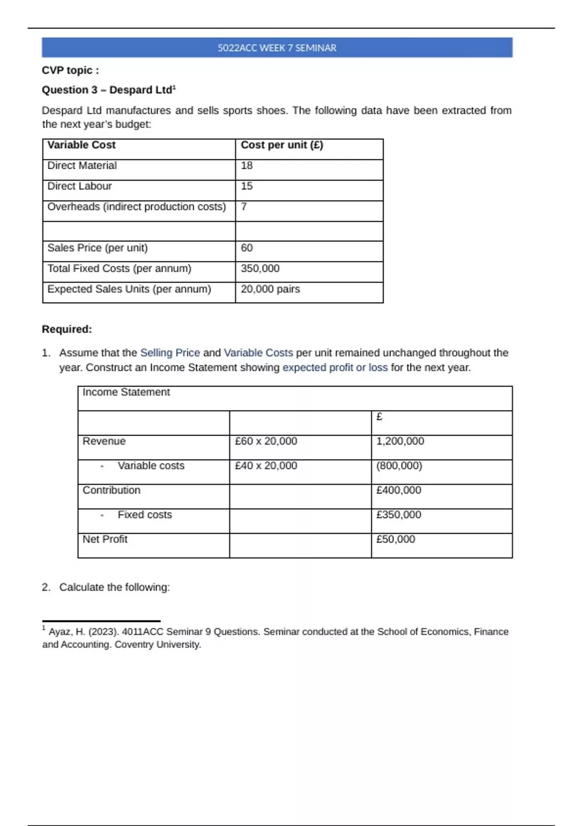 Despard Ltd manufactures and sells sports shoes. The following data have been extracted from