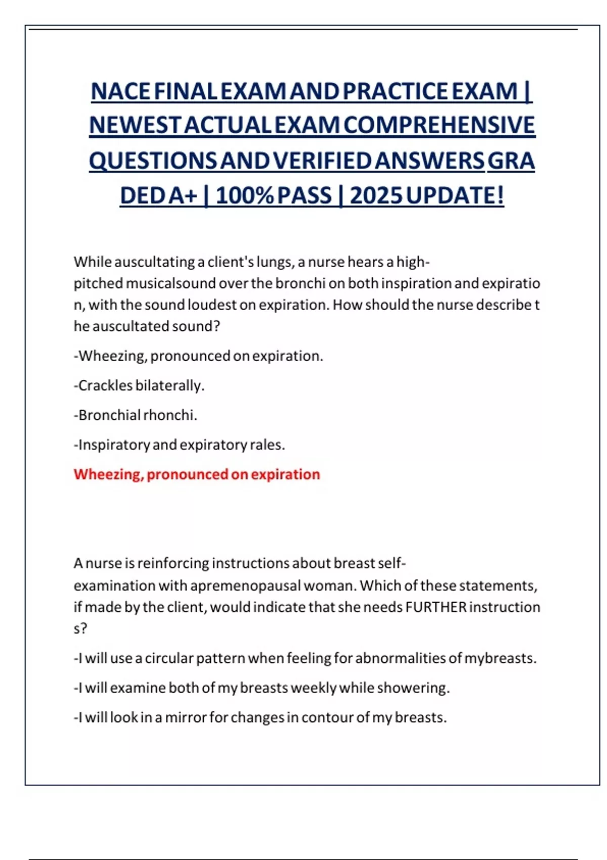 Nace final exam and practice exam 2025 NEWEST ACTUAL EXAM COMPREHENSIVE QUESTIONS AND VERIFIED ANSWERS GRADED A+ 100% PASS 2025 UPDATE!
