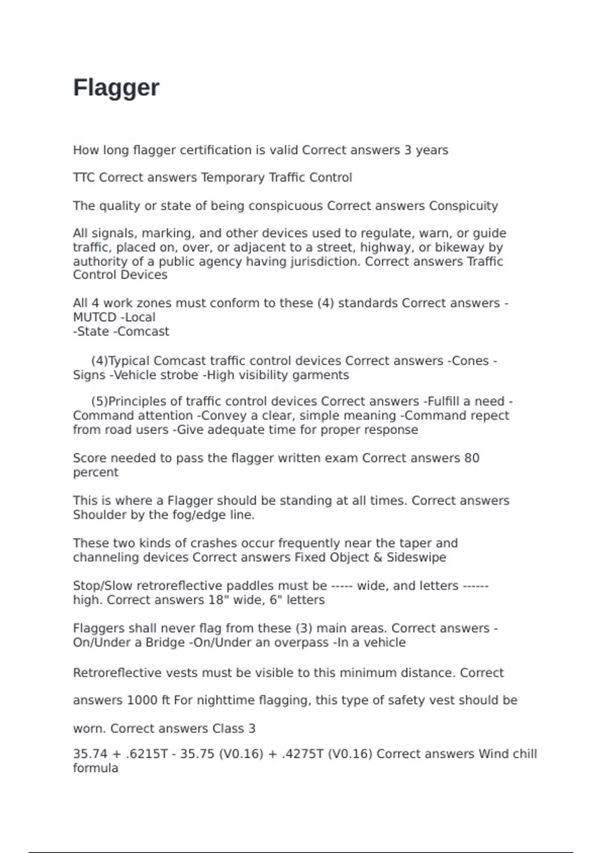 How long flagger certification is valid Correct answers 3 years TTC Correct answers Temporary Traffic Control The quality or state of being conspicuous Correct answers Conspicuity All signals, marking, and other devices used to regulate, warn, or guide traffic, placed on, over, or adjacent to a street, highway, or bikeway by authority of a public agency having jurisdiction. Correct answers Traffic Control Devices All 4 work zones must conform to these (4) standards Correct answers -MUTCD -Local -State -Comcast (4) Typical Comcast traffic control devices Correct answers -Cones -Signs -Vehicle strobe -High visibility garments (5) Principles of traffic control devices Correct answers -Fulfill a need -Command attention -Convey a clear, simple meaning -Command repect from road users -Give adequate time for proper response Score needed to pass the flagger written exam Correct answers 80 percent This is where a Flagger should be standing at all times. Correct answers Shoulder by the fog/edge line. These two kinds of crashes occur frequently near the taper and channeling devices Correct answers Fixed Object & Sideswipe Stop/Slow retroreflective paddles must be ----- wide, and letters ------ high. Correct answers 18" wide, 6" letters Flaggers shall never flag from these (3) main areas. Correct answers -On/Under a Bridge -On/Under an overpass -In a vehicle Retroreflective vests must be visible to this minimum distance. Correct answers 1000 ft For nighttime flagging, this type of safety vest should be worn. Correct answers Class 3 35.74 + .6215T - 35.75 (V0.16) + .4275T (V0.16) Correct answers Wind chill formula