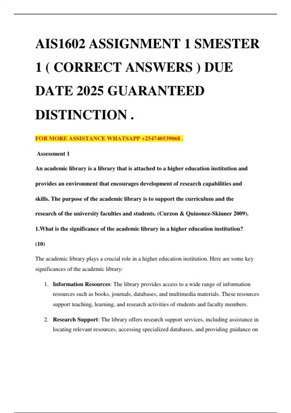 AIS1602 ASSIGNMENT 1 SMESTER 1 ( CORRECT ANSWERS ) DUE DATE 2025 GUARANTEED DISTINCTION . FOR MORE ASSISTANCE . Assessment 1 An academic library is a library that is attached to a higher education institution and provides an environment that encourages development of research capabilities and skills. The purpose of the academic library is to support the curriculum and the research of the university faculties and students. (Curzon & Quinonez-Skinner 2009). 1.What is the significance of the academic library in a higher education institution? (10) The academic library plays a crucial role in a higher education institution. Here are some key significances of the academic library: 1. Information Resources: The library provides access to a wide range of information resources such as books, journals, databases, and multimedia materials. These resources support teaching, learning, and research activities of students and faculty members. 2. Research Support: The library offers research support services, including assistance in locating relevant resources, accessing specialized databases, and providing guidance on