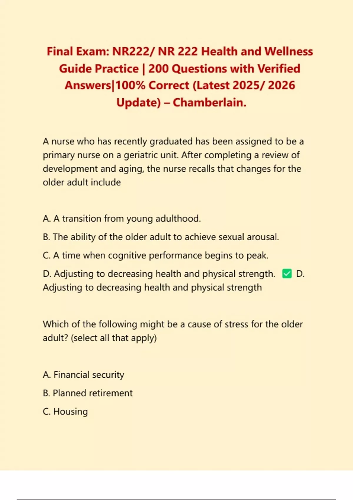 ,D. Adjusting to decreasing health and physical strength