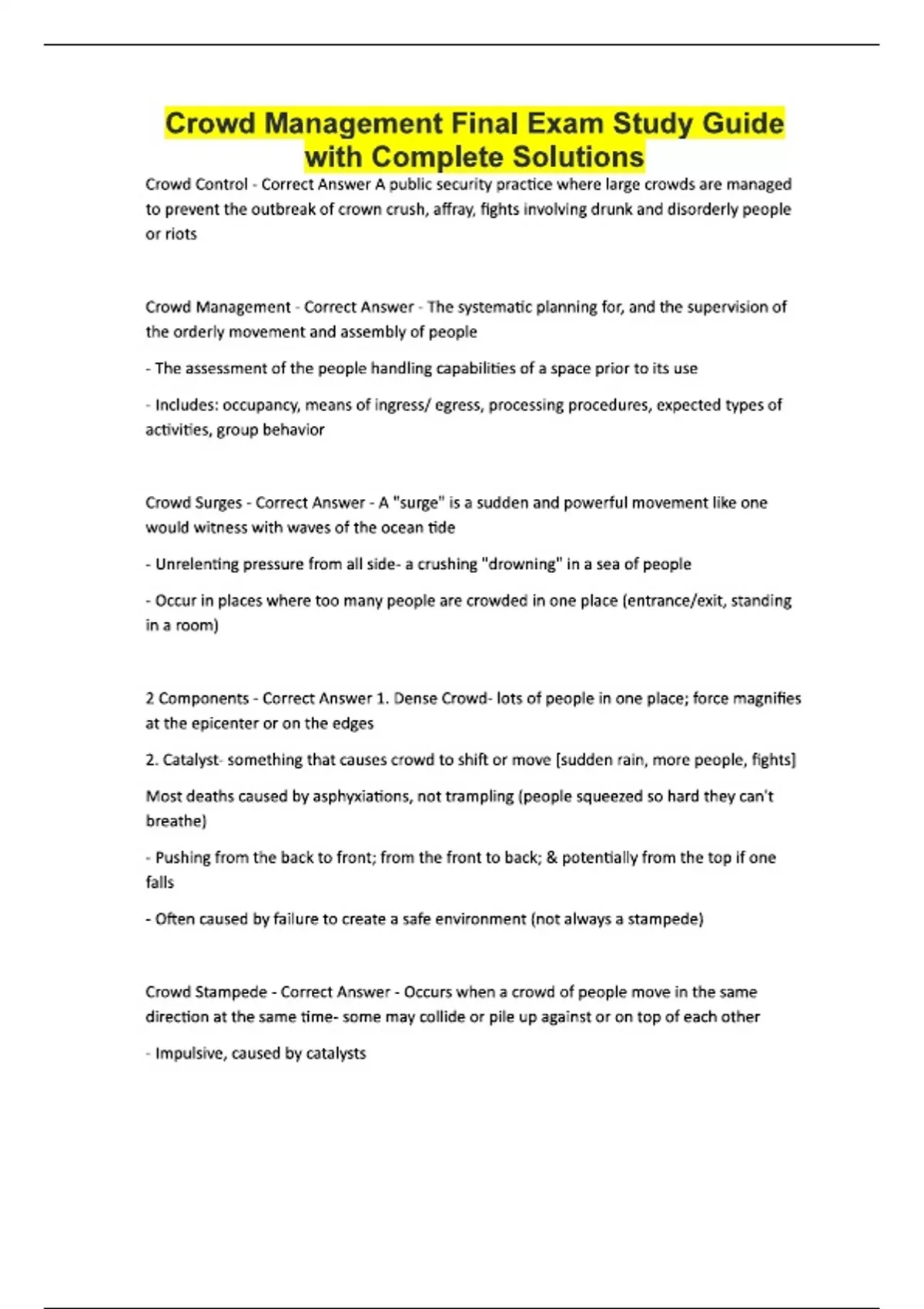 Crowd Management Final Exam Study Guide with Complete Solutions Crowd Control - Correct Answer A public security practice where large crowds are managed to prevent the outbreak of crown crush, affray, fights involving drunk and disorderly people or riots Crowd Management - Correct Answer - The systematic planning for, and the supervision of the orderly movement and assembly of people - The assessment of the people handling capabilities of a space prior to its use - Includes: occupancy, means of ingress/ egress, processing procedures, expected types of activities, group behavior Crowd Surges - Correct Answer - A "surge" is a sudden and powerful movement like one would witness with waves of the ocean tide - Unrelenting pressure from all side- a crushing "drowning" in a sea of people - Occur in places where too many people are crowded in one place (entrance/exit, standing in a room) 2 Components - Correct Answer 1. Dense Crowd- lots of people in one place; force magnifies at the epicenter or on the edges 2. Catalyst- something that causes crowd to shift or move [sudden rain, more people, fights] Most deaths caused by asphyxiations, not trampling (people squeezed so hard they can't breathe) - Pushing from the back to front; from the front to back; & potentially from the top if one falls - Often caused by failure to create a safe environment (not always a stampede)