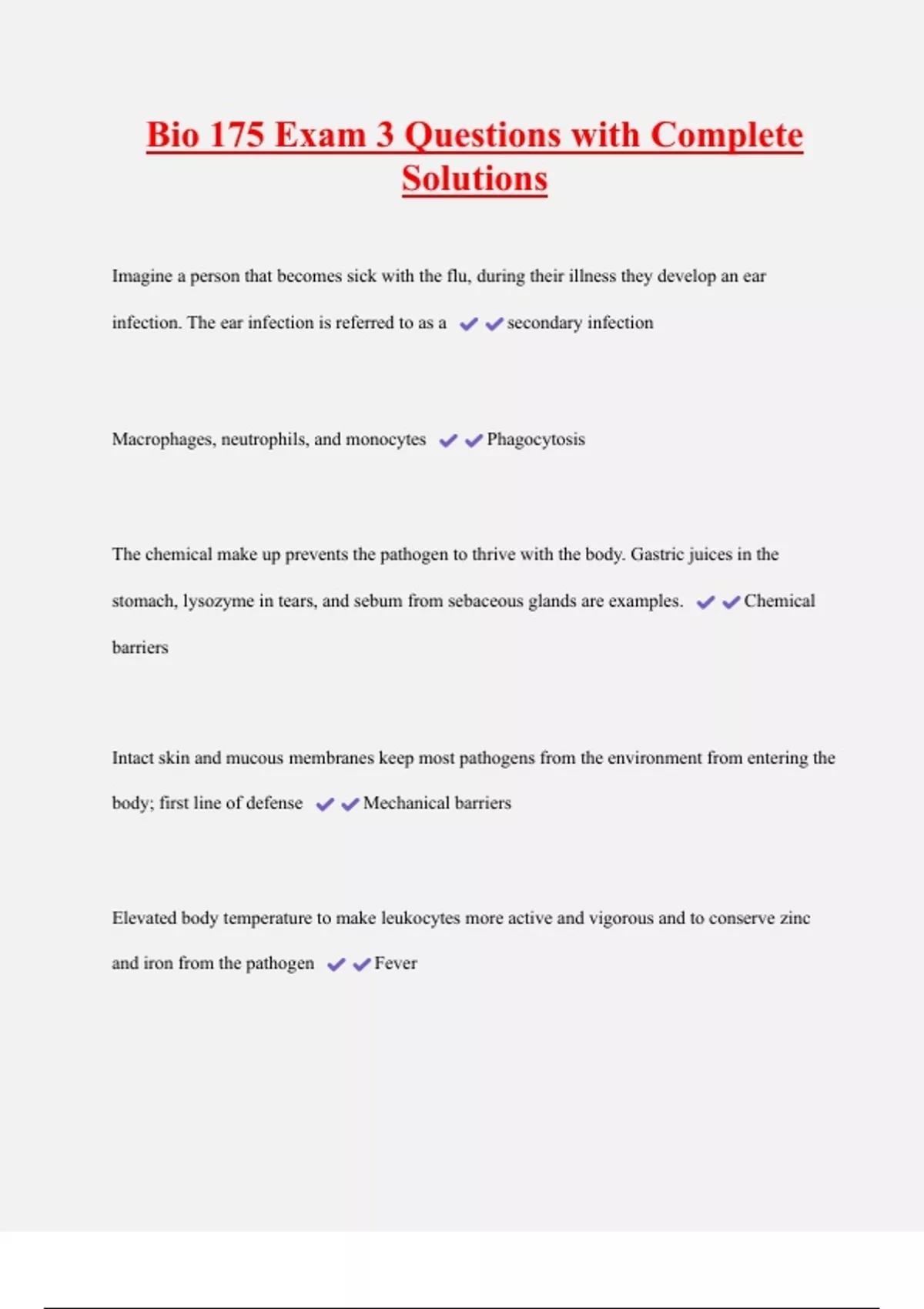 Bio 175 Exam 3 Questions with Complete Solutions Imagine a person that becomes sick with the flu, during their illness they develop an ear infection. The ear infection is referred to as a secondary infection Macrophages, neutrophils, and monocytes Phagocytosis The chemical make up prevents the pathogen to thrive with the body. Gastric juices in the stomach, lysozyme in tears, and sebum from sebaceous glands are examples. Chemical barriers