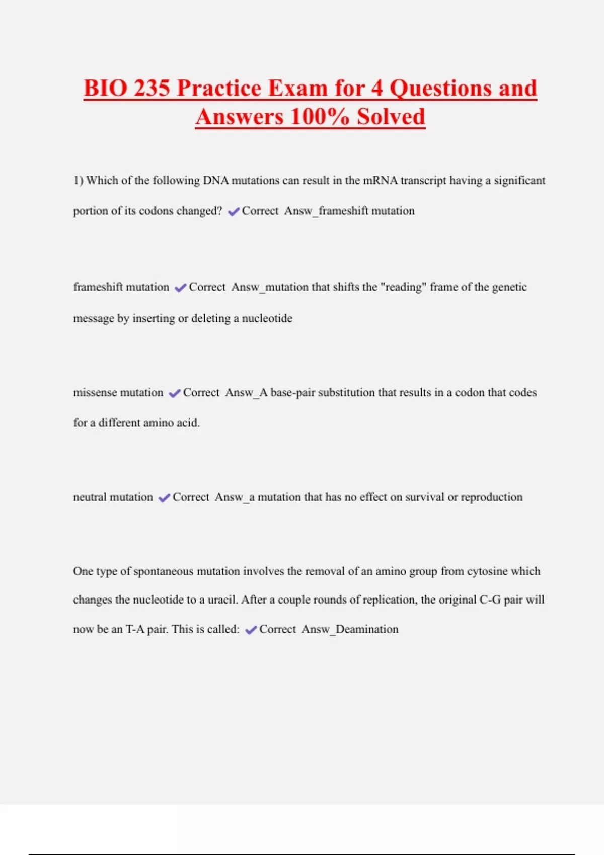 BIO 235 Practice Exam for 4 Questions and Answers 100% Solved 1) Which of the following DNA mutations can result in the mRNA transcript having a significant portion of its codons changed? Correct Answ_frameshift mutation frameshift mutation Correct Answ_mutation that shifts the "reading" frame of the genetic message by inserting or deleting a nucleotide missense mutation Correct Answ_A base-pair substitution that results in a codon that codes for a different amino acid