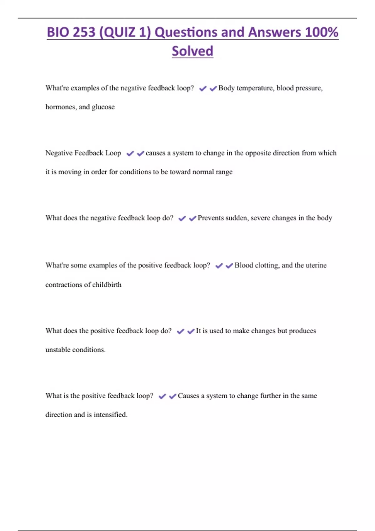 BIO 253 (QUIZ 1) Questions and Answers 100% Solved What're examples of the negative feedback loop? Body temperature, blood pressure, hormones, and glucose Negative Feedback Loop causes a system to change in the opposite direction from which it is moving in order for conditions to be toward normal range What does the negative feedback loop do? Prevents sudden, severe changes in the body