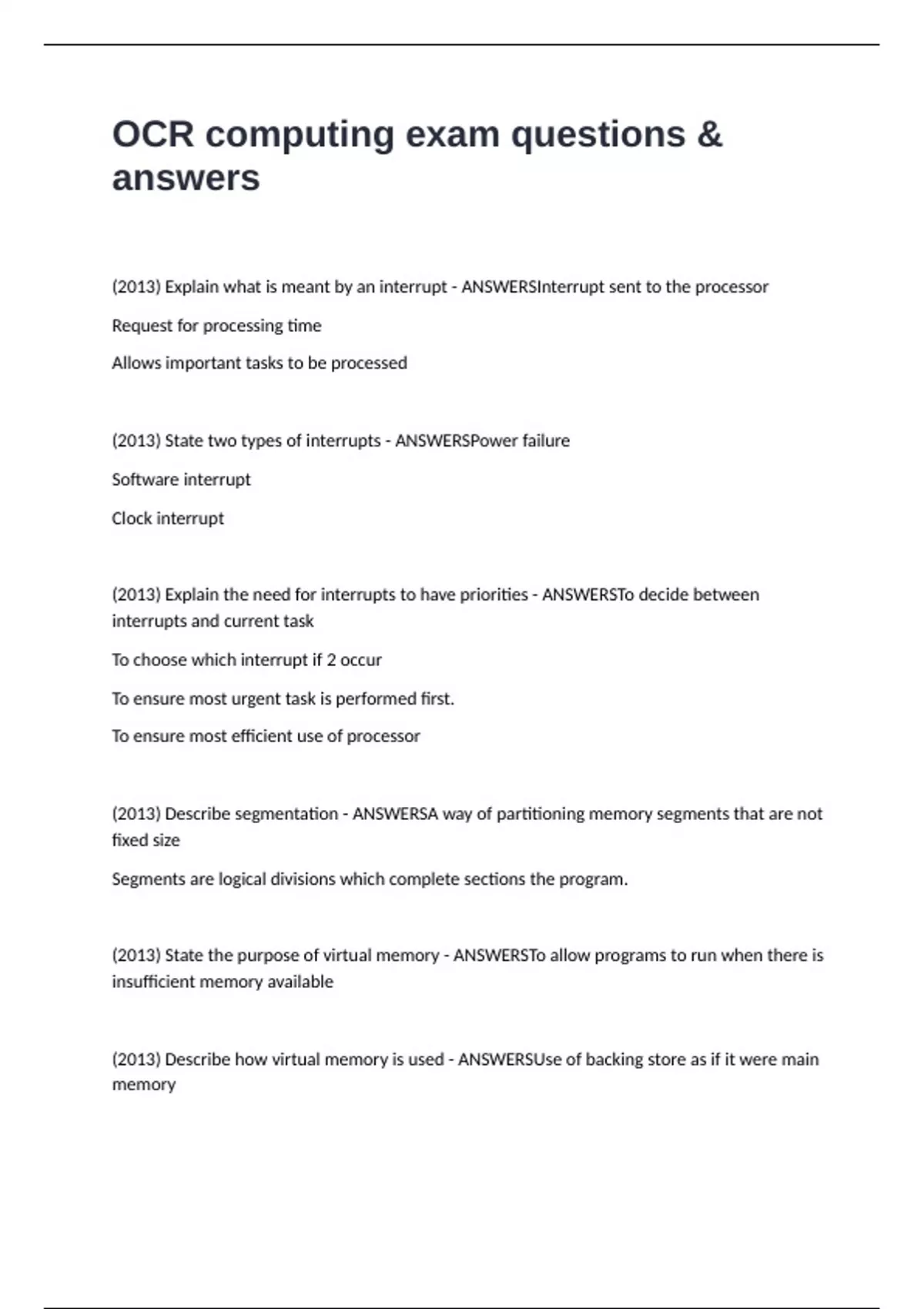 (2013) Explain what is meant by an interrupt - ANSWERSInterrupt sent to the processor
