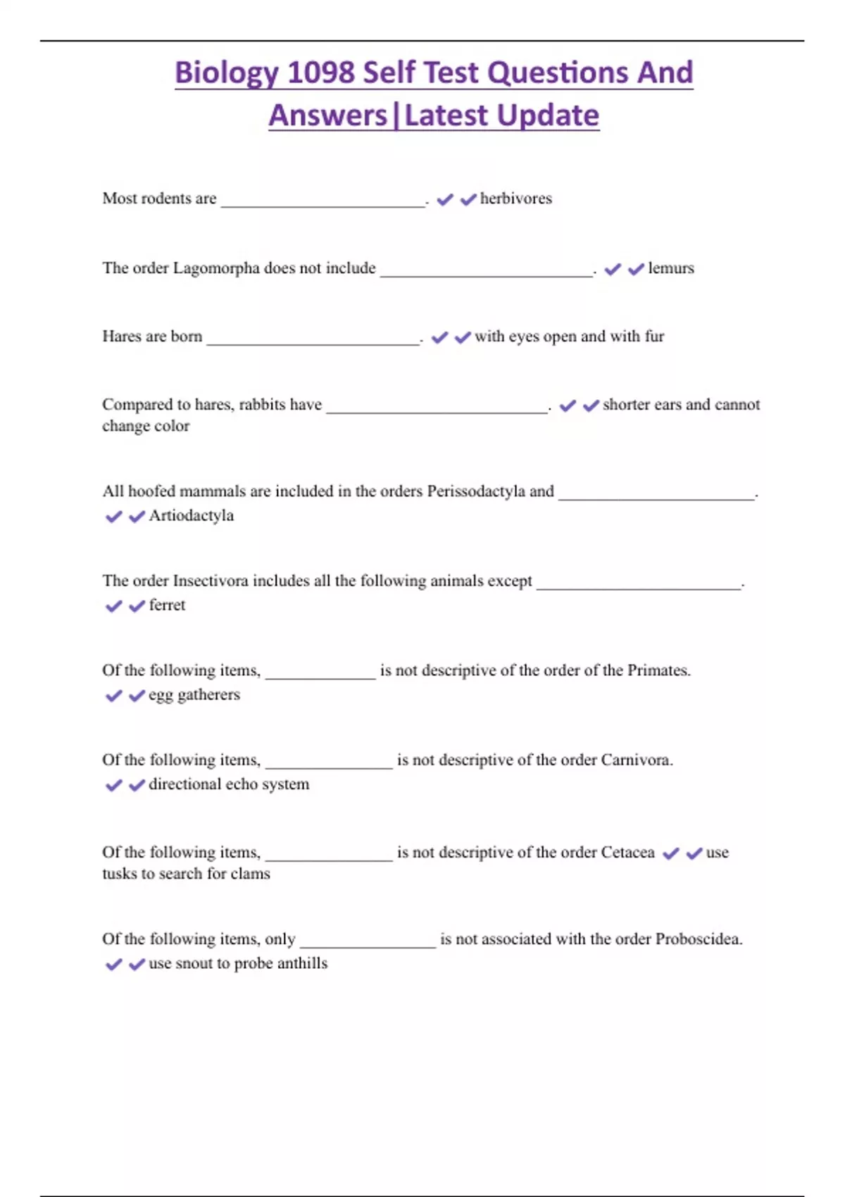 Biology 1098 Self Test Questions And Answers|Latest Update Most rodents are ________________________. herbivores The order Lagomorpha does not include _________________________. lemurs Hares are born _________________________. with eyes open and with fur Compared to hares, rabbits have __________________________. shorter ears and cannot change color All hoofed mammals are included in the orders Perissodactyla and _______________________. Artiodactyla