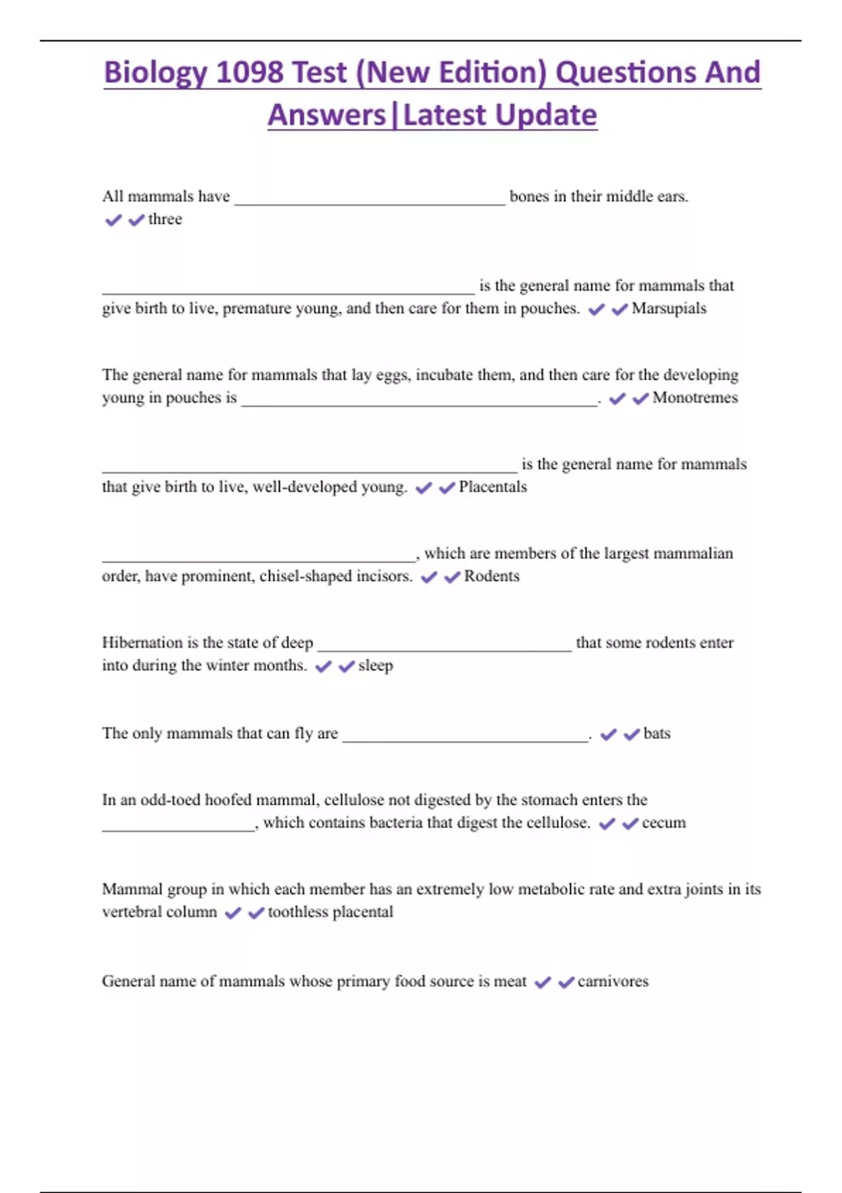 Biology 1098 Test (New Edition) Questions And Answers|Latest Update All mammals have ________________________________ bones in their middle ears. three ____________________________________________ is the general name for mammals that give birth to live, premature young, and then care for them in pouches. Marsupials The general name for mammals that lay eggs, incubate them, and then care for the developing young in pouches is __________________________________________. Monotremes _________________________________________________ is the general name for mammals that give birth to live, well-developed young. Placentals