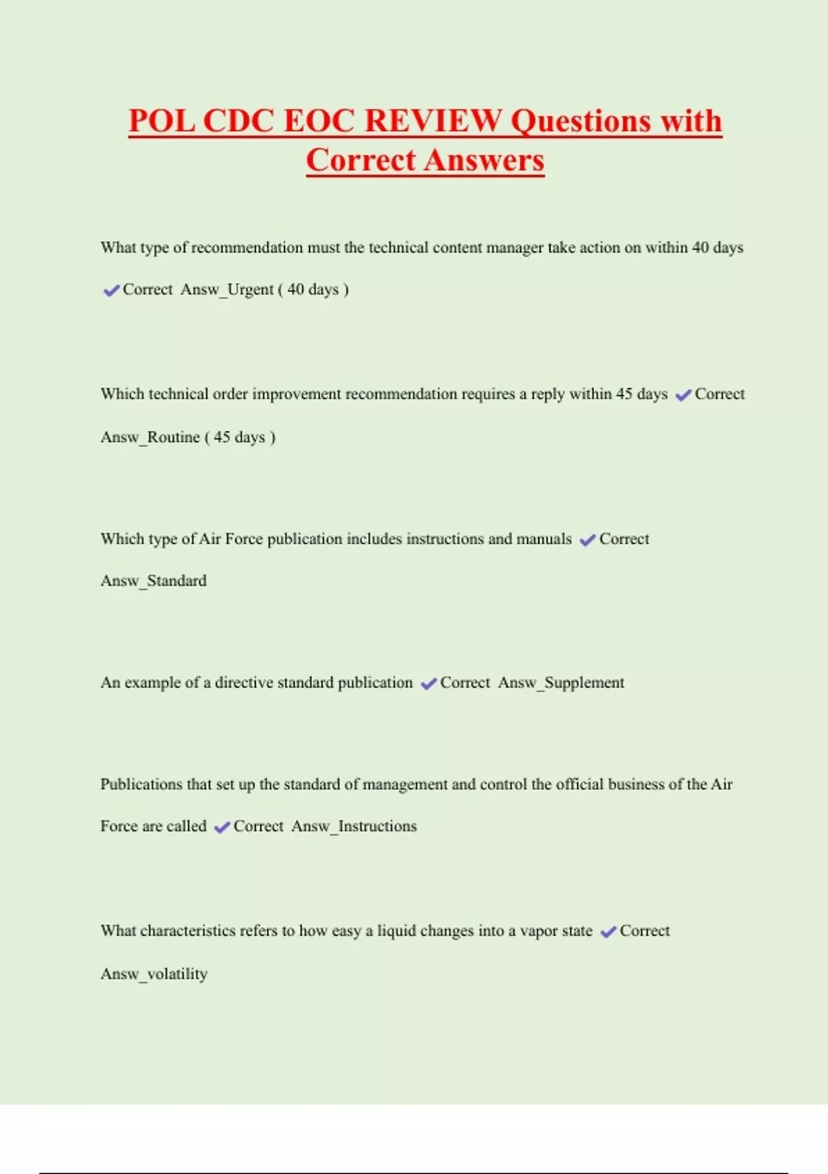 POL CDC EOC REVIEW Questions with Correct Answers What type of recommendation must the technical content manager take action on within 40 days Correct Answ_Urgent ( 40 days ) Which technical order improvement recommendation requires a reply within 45 days Correct Answ_Routine ( 45 days ) Which type of Air Force publication includes instructions and manuals Correct Answ_Standard