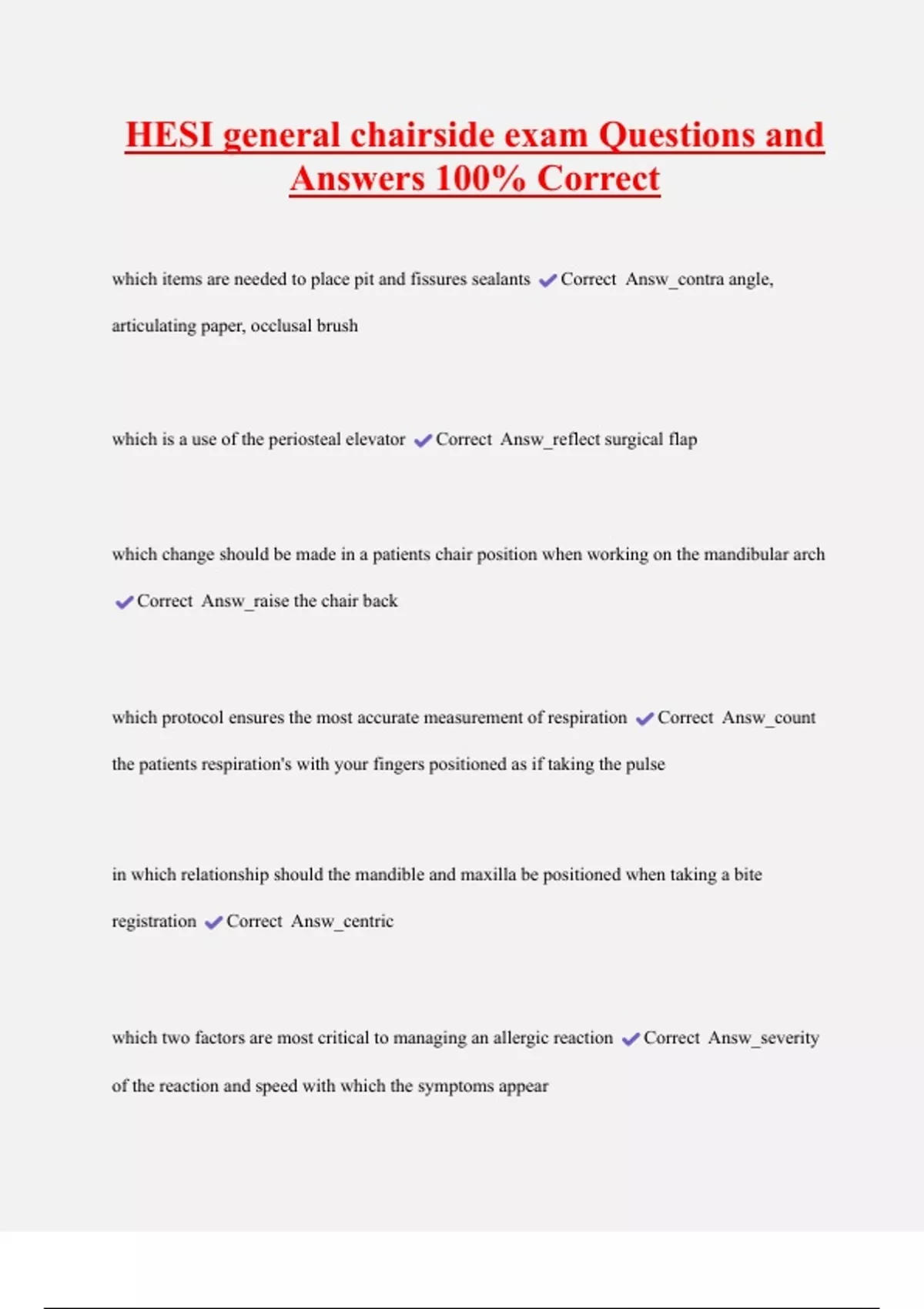HESI general chairside exam Questions and Answers 100% Correct which items are needed to place pit and fissures sealants Correct Answ_contra angle, articulating paper, occlusal brush which is a use of the periosteal elevator Correct Answ_reflect surgical flap which change should be made in a patients chair position when working on the mandibular arch Correct Answ_raise the chair back