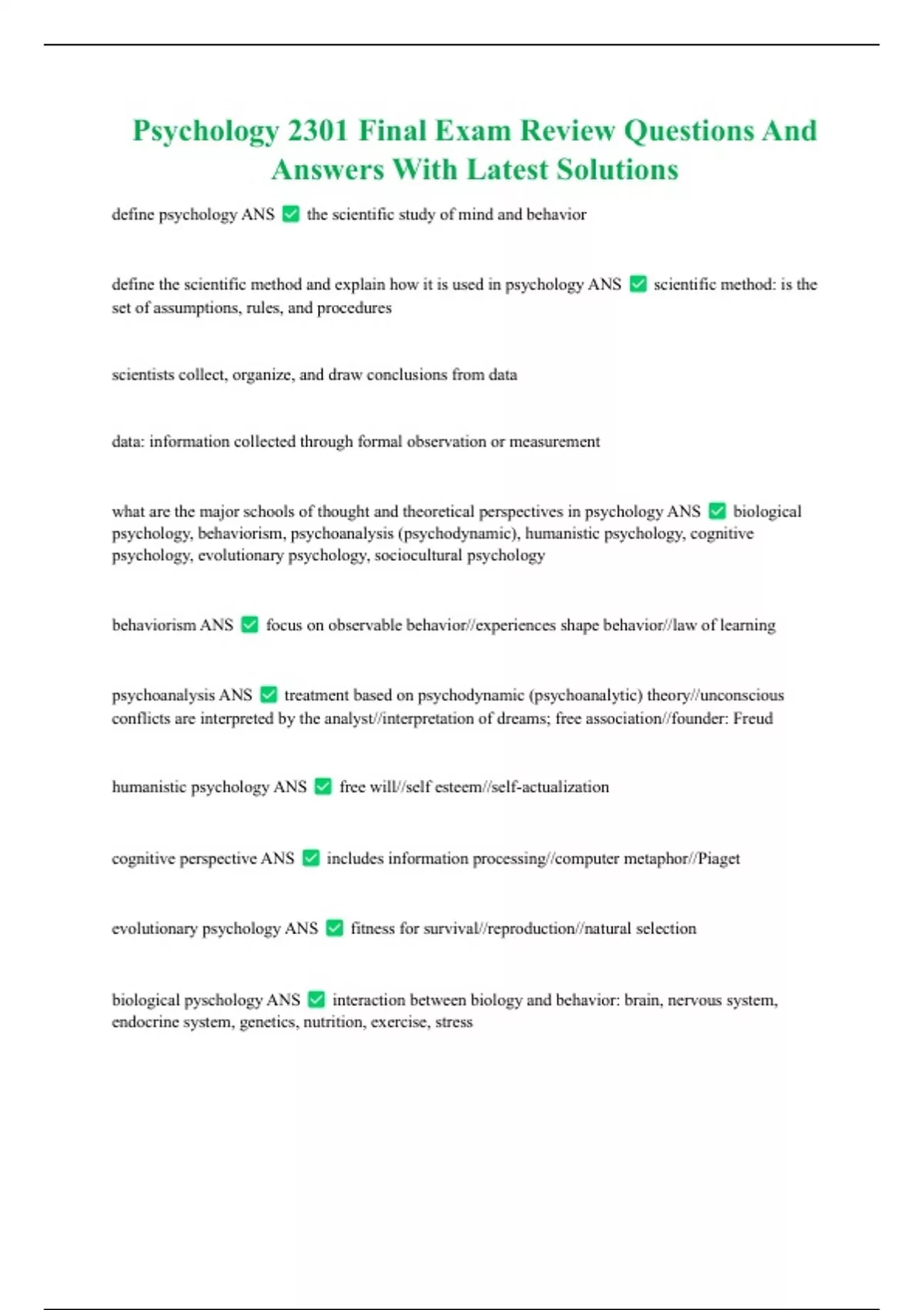 Psychology 2301 Final Exam Review Questions And Answers With Latest Solutions define psychology ANS the scientific study of mind and behavior define the scientific method and explain how it is used in psychology ANS scientific method: is the set of assumptions, rules, and procedures scientists collect, organize, and draw conclusions from data data: information collected through formal observation or measurement what are the major schools of thought and theoretical perspectives in psychology ANS biological psychology, behaviorism, psychoanalysis (psychodynamic), humanistic psychology, cognitive psychology, evolutionary psychology, sociocultural psychology behaviorism ANS focus on observable behavior//experiences shape behavior//law of learning psychoanalysis ANS treatment based on psychodynamic (psychoanalytic) theory//unconscious conflicts are interpreted by the analyst//interpretation of dreams; free association//founder: Freud humanistic psychology ANS free will//self esteem//self-actualization cognitive perspective ANS includes information processing//computer metaphor//Piaget evolutionary psychology ANS fitness for survival//reproduction//natural selection biological pyschology ANS interaction between biology and behavior: brain, nervous system, endocrine system, genetics, nutrition, exercise, stress sociocultural approach ANS humans influenced by: social situations and culture... also the differences in these two what are the research methods ANS naturalistic observation, laboratory observations, case study, survey, correlation, correlation coefficient case study ANS in depth study of one or more individual's experiences and behavior survey ANS interview or questionnaire about measuring beliefs or behaviors in a sample group naturalistic observation ANS research base