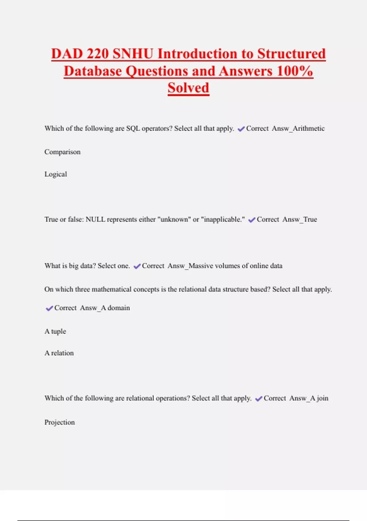 DAD 220 SNHU Introduction to Structured Database Questions and Answers 100% Solved Which of the following are SQL operators? Select all that apply. Correct Answ_Arithmetic Comparison Logical True or false: NULL represents either "unknown" or "inapplicable." Correct Answ_True