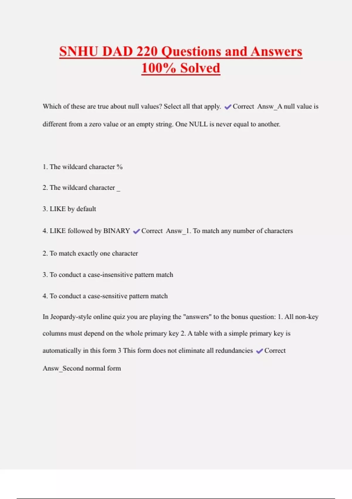 SNHU DAD 220 Questions and Answers 100% Solved Which of these are true about null values? Select all that apply. Correct Answ_A null value is different from a zero value or an empty string. One NULL is never equal to another. 1. The wildcard character % 2. The wildcard character _ 3. LIKE by default 4. LIKE followed by BINARY Correct Answ_1. To match any number of characters 2. To match exactly one character 3. To conduct a case-insensitive pattern match 4. To conduct a case-sensitive pattern match In Jeopardy-style online quiz you are playing the "answers" to the bonus question: 1. All non-key columns must depend on the whole primary key 2. A table with a simple primary key is automatically in this form 3 This form does not eliminate all redundancies Correct Answ_Second normal form