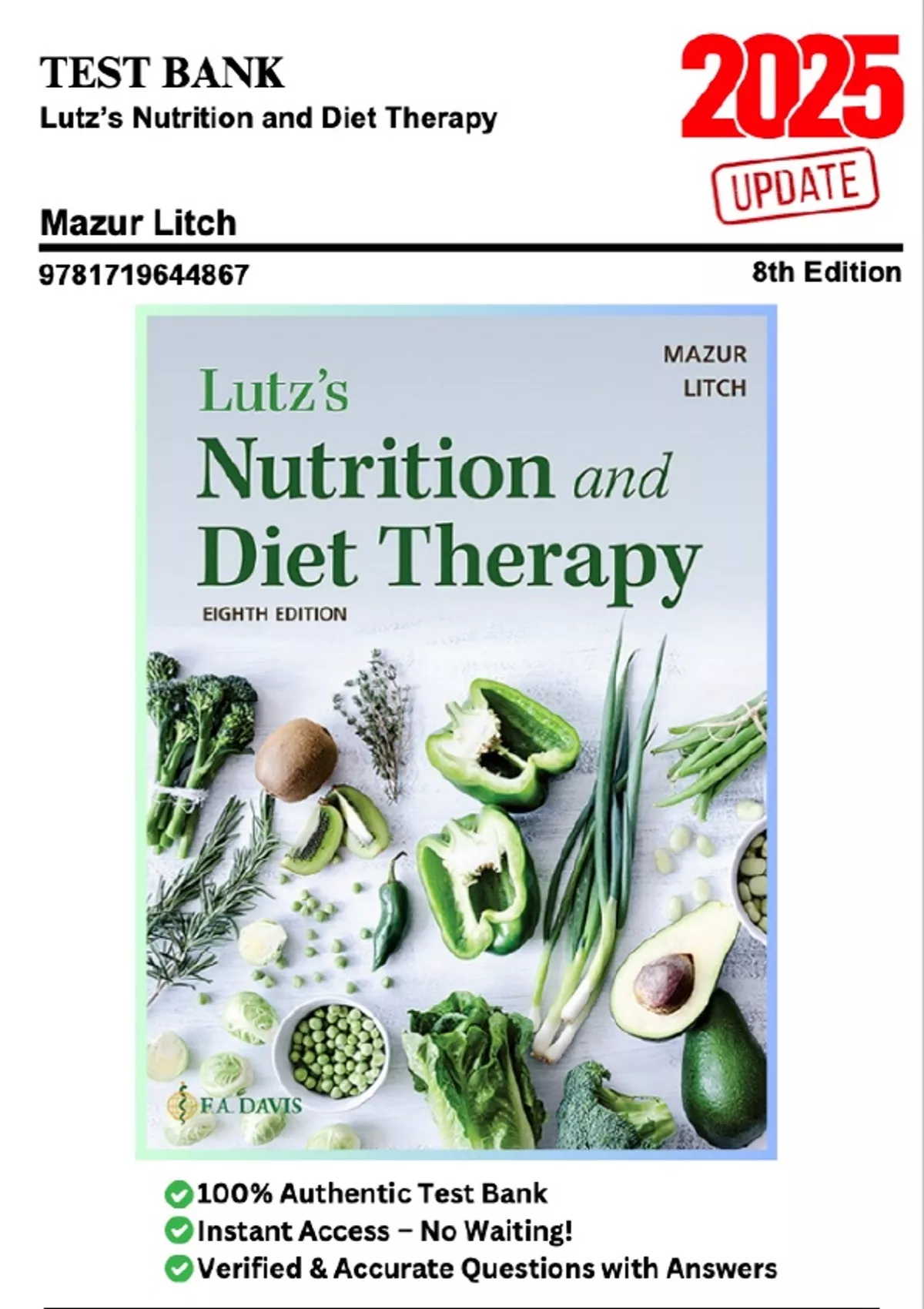 Test Bank for Lutz’s Nutrition and Diet Therapy, 8th Edition by Mazur Litch, , Covering Chapters 1-24 | Includes Rationales