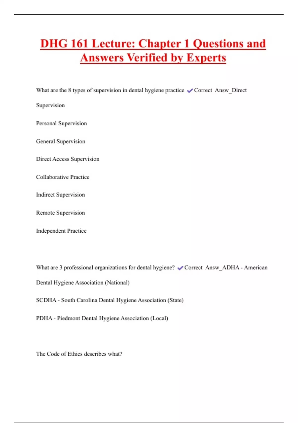 DHG 161 Lecture: Chapter 1 Questions and Answers Verified by Experts What are the 8 types of supervision in dental hygiene practice Correct Answ_Direct Supervision Personal Supervision General Supervision Direct Access Supervision Collaborative Practice Indirect Supervision Remote Supervision Independent Practice
