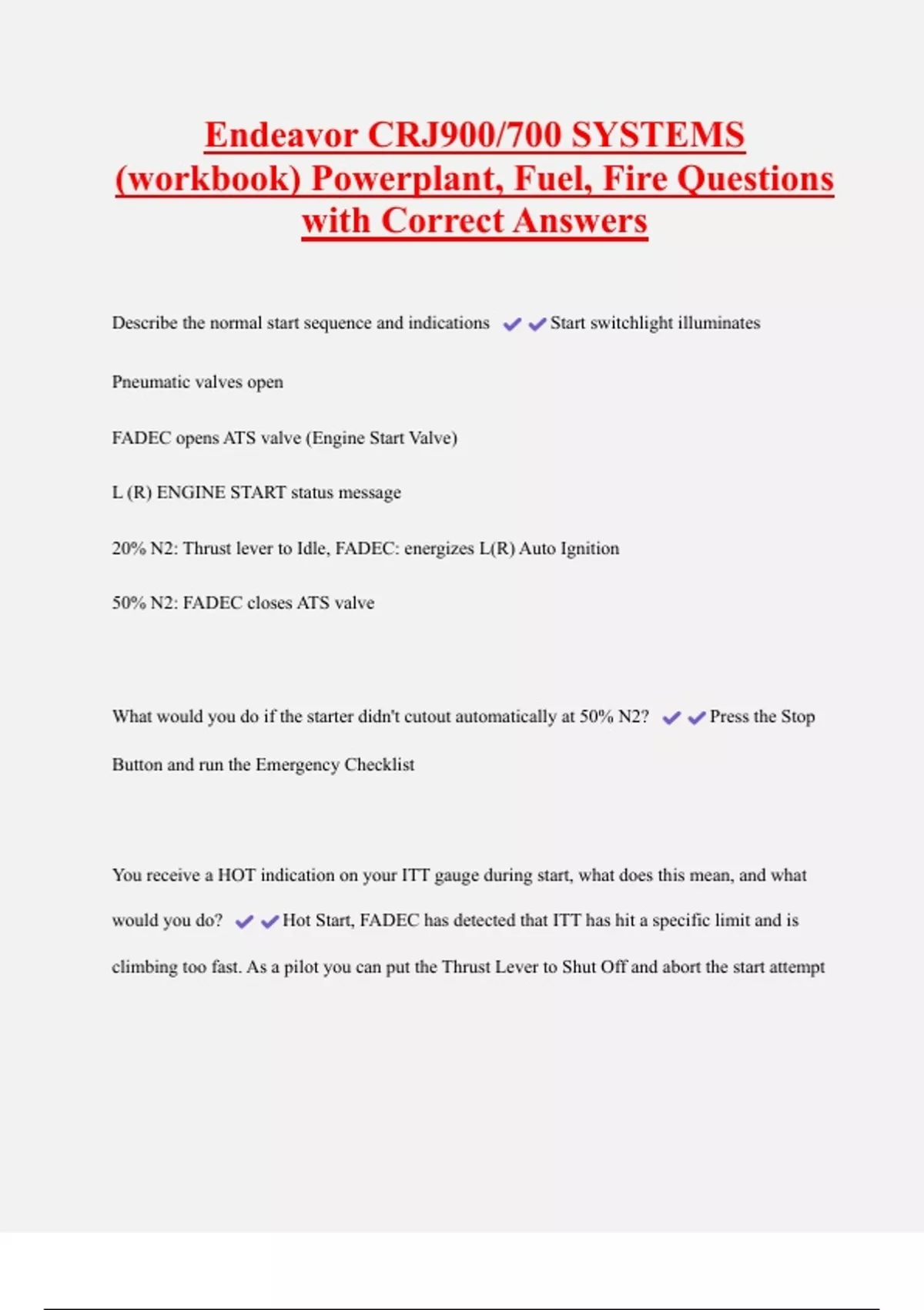 Endeavor CRJ900/700 SYSTEMS (workbook) Powerplant, Fuel, Fire Questions with Correct Answers