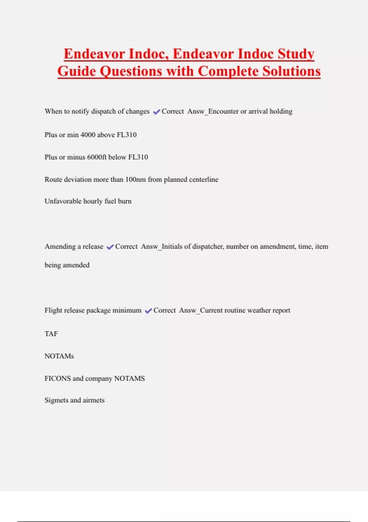 Endeavor Indoc, Endeavor Indoc Study Guide Questions with Complete Solutions When to notify dispatch of changes Correct Answ_Encounter or arrival holding Plus or min 4000 above FL310 Plus or minus 6000ft below FL310 Route deviation more than 100nm from planned centerline Unfavorable hourly fuel burn