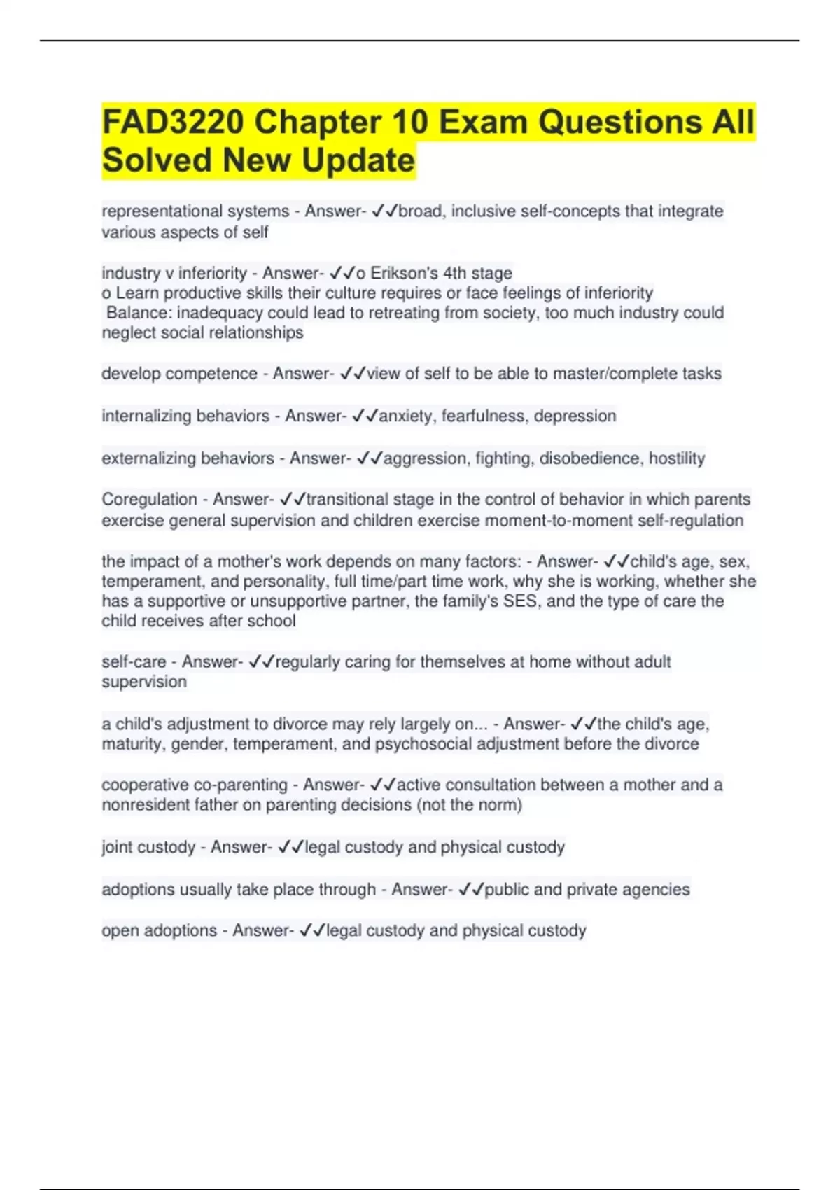 FAD3220 Chapter 10 Exam Questions All Solved New Update representational systems - Answer- broad, inclusive self-concepts that integrate various aspects of self industry v inferiority - Answer- o Erikson's 4th stage o Learn productive skills their culture requires or face feelings of inferiority Balance: inadequacy could lead to retreating from society, too much industry could neglect social relationships develop competence - Answer- view of self to be able to master/complete tasks internalizing behaviors - Answer- anxiety, fearfulness, depression externalizing behaviors - Answer- aggression, fighting, disobedience, hostility Coregulation - Answer- transitional stage in the control of behavior in which parents exercise general supervision and children exercise moment-to-moment self-regulation the impact of a mother's work depends on many factors: - Answer- child's age, sex, temperament, and personality, full time/part time work, why she is working, whether she has a supportive or unsupportive partner, the family's SES, and the type of care the child receives after school self-care - Answer- regularly caring for themselves at home without adult supervision