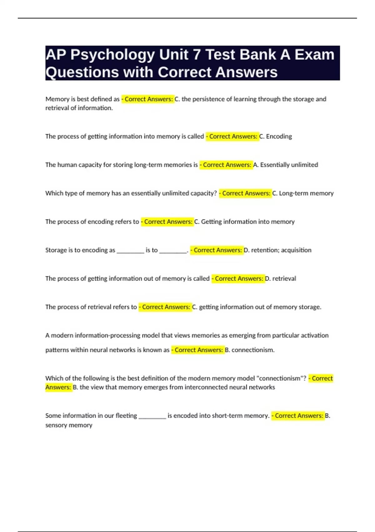 AP Psychology Unit 7 Test Bank A Exam Questions with Correct Answers Memory is best defined as - Correct Answers: C. the persistence of learning through the storage and retrieval of information. The process of getting information into memory is called - Correct Answers: C. Encoding The human capacity for storing long-term memories is - Correct Answers: A. Essentially unlimited Which type of memory has an essentially unlimited capacity? - Correct Answers: C. Long-term memory The process of encoding refers to - Correct Answers: C. Getting information into memory Storage is to encoding as ________ is to ________. - Correct Answers: D. retention; acquisition The process of getting information out of memory is called - Correct Answers: D. retrieval The process of retrieval refers to - Correct Answers: C. getting information out of memory storage. A modern information-processing model that views memories as emerging from particular activation patterns within neural networks is known as - Correct Answers: B. connectionism. Which of the following is the best definition of the modern memory model "connectionism"? - Correct Answers: B. the view that memory emerges from interconnected neural networks Some information in our fleeting ________ is encoded into short-term memory. - Correct Answers: B. sensory memory Your consciously activated but limited-capacity memory is called ________ memory. - Correct Answers: A. short-term After looking up his friend's phone number, Alex was able to remember it only long enough to dial it correctly. In this case, the telephone number was clearly stored in his ________ memory. - Correct Answers: B. short-term A flashbulb memory would typically be stored in ________ memory. - Correct Answers: D. long-term The relatively permanent and limitless storehouse of the memory system is called ________ memory. - Correct Answers: C. long-term Every day as she walks to school, Mamie passes a mural painted on the side of a building. However, when asked, she says she does not remember ever seeing it. Which of the following is the best explanation for this occurrence? - Correct Answers: B. Mamie has not paid attention to the incoming information so it was not encoded into long-term memory. As his AP psychology teacher was lecturing, Tanner was thinking about competing in a swim meet later that afternoon. Where are Tanner's current thoughts being processed? - Correct Answers: C. working memory To recognize the active information processing that occurs in short-term memory, researchers have characterized it as ________ memory. - Correct Answers: B. The integration of new incoming information with knowledge retrieved from long-term memory involves the activity of - Correct Answers: D Which term best describes parallel processing? - Correct Answers: D Automatic processing and effortful processing involve two types of - Correct Answers: A How does the brain's capacity for parallel processing relate to encoding new memories? - Correct Answers: B We can encode many sensory experiences simultaneously, some automatically, because of which property of the brain? - Correct Answers: B Encoding that occurs with no effort or a minimal level of conscious attention is known as - Correct Answers: C Automatic processing occurs without - Correct Answers: C During her psychology test, Kelsey could not remember the meaning of the term proactive interference. Surprisingly, however, she accurately remembered that the term appeared on the fourth line of a left-hand page in her textbook. Her memory of this incidental information is best explained in terms of - Correct Answers: A During the course of a day, people may unconsciously encode the sequence of the day's events. This best illustrates - Correct Answers: B While reading a novel at a rate of nearly 500 words per minute, Megan effortlessly understands almost every word. This ability highlights the importance of - Correct Answers: B You are most likely to automatically encode information about - Correct Answers: D The effortful processing of information - Correct Answers: C Effortful processing can occur only with - Correct Answers: B Iconic memory refers to - Correct Answers: B The address for obtaining tickets to a popular quiz show flashes on the TV screen, but the image disappears before Sergei has had a chance to write down the complete address. To his surprise, however, he has retained a momentary mental image of the five-digit zip code. His experience best illustrates ________ memory. - Correct Answers: A Explicit memory is to long-term memory as iconic memory is to ________ memory. - Correct Answers: A For a fraction of a second after the lightning flash disappeared, Ileana retained a vivid mental image of its ragged edges. Her experience most clearly illustrates the nature of _______ memory. - Correct Answers: A By presenting research participants with three rows of three letters each for only a fraction of a second, Sperling demonstrated that people have ________ memory. - Correct Answers: D When Sperling visually displayed three rows of three letters each for only one-twentieth of a second, research participants - Correct Answers: C Iconic memory is to echoic memory as ________ is to ________. - Correct Answers: C For a moment after hearing his dog's high-pitched bark, Mr. Silvers has a vivid auditory impression of the dog's yelp. His experience most clearly illustrates ________ memory. - Correct Answers: E Sounds and words that are not immediately attended to can still be recalled a couple of seconds later because of our ________ memory. - Correct Answers: B While your Mom is lecturing you about cleaning your room, you lose concentration. Then, suddenly you hear the significant words, "no car keys." When she asks, "Are you listening to me?" you are able to repeat the last few things she said before mentioning car keys. Which of the following best explains this phenomenon? - Correct Answers: B Peterson and Peterson demonstrated that unreh