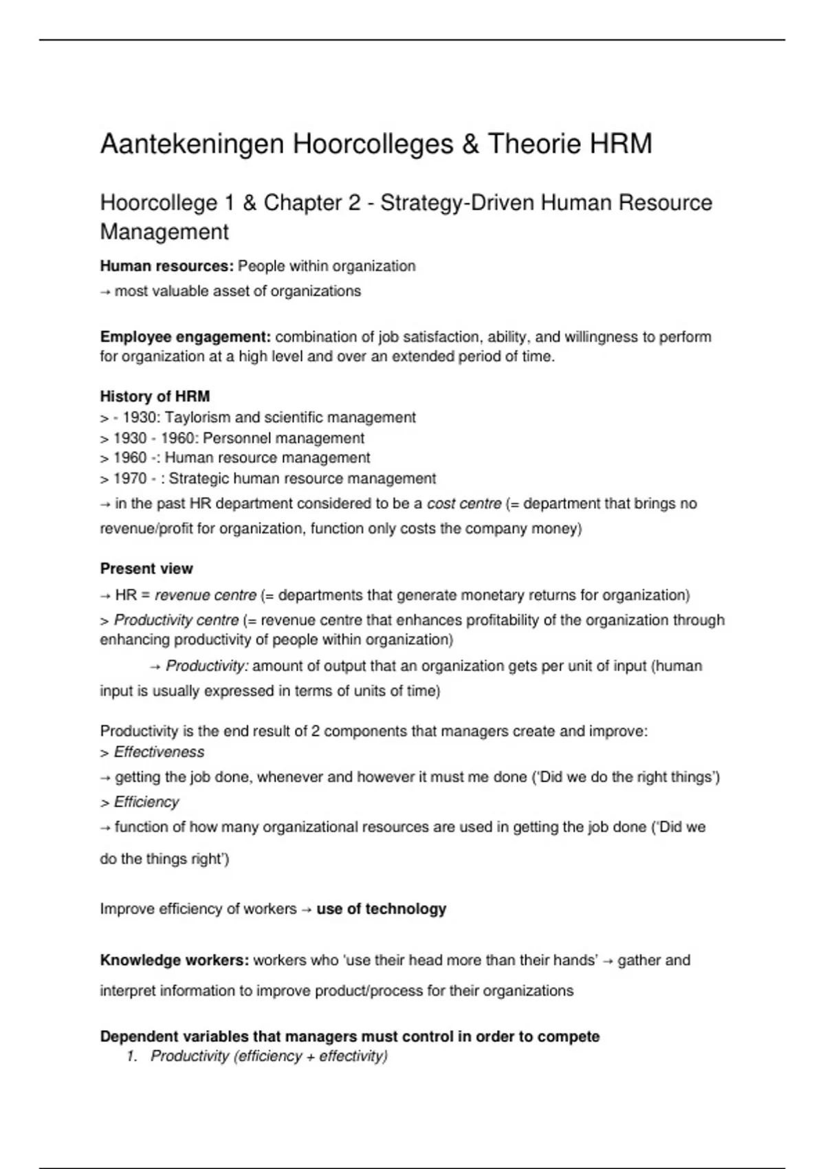Summary of the lectures and the theory of chapters 2,4,5,6,8,11 & 12 of the Human Resource Management B&M course at the University of Groningen