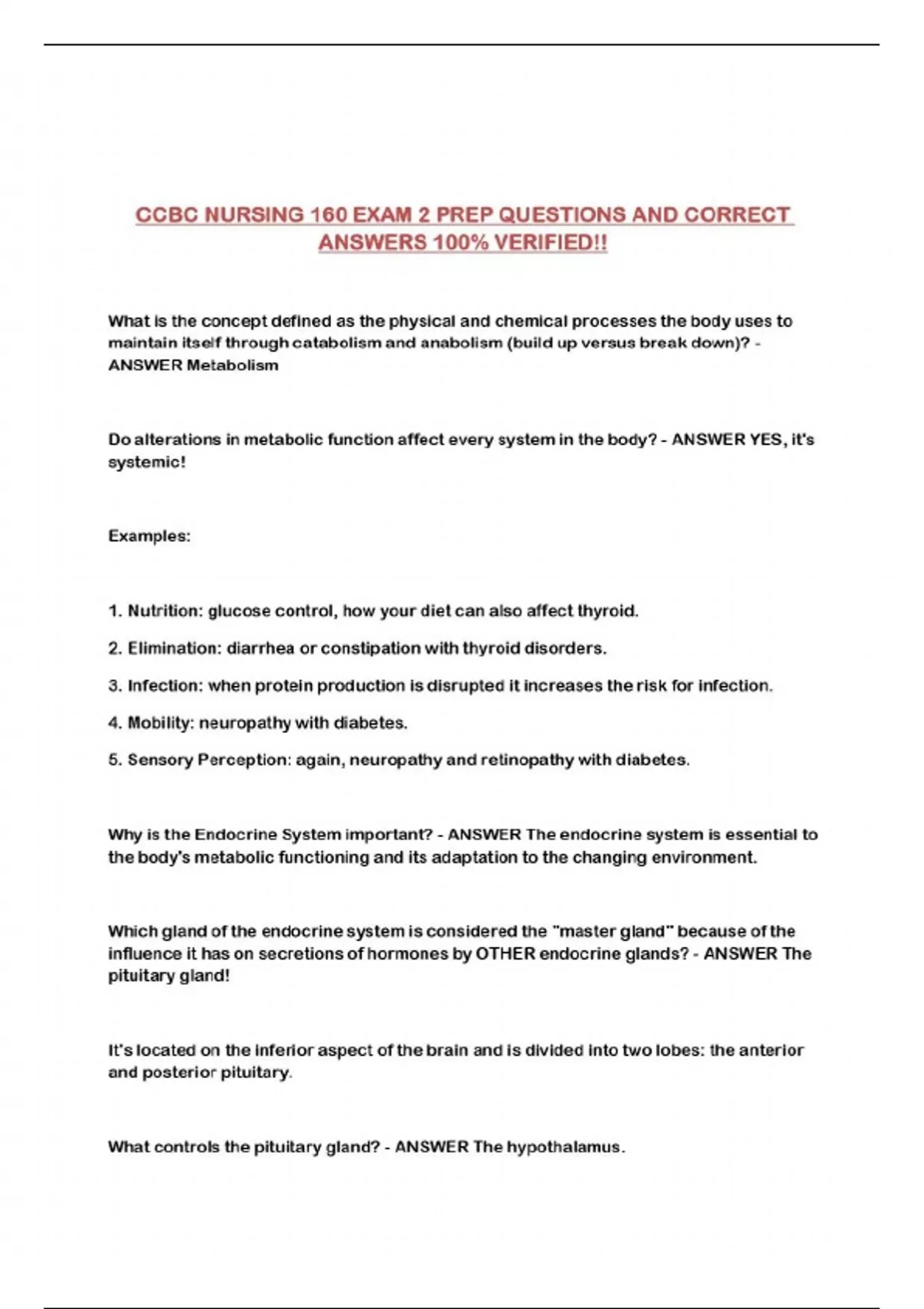 CCBC NURSING 160 EXAM 2 PREP QUESTIONS AND CORRECT ANSWERS 100% VERIFIED!!...