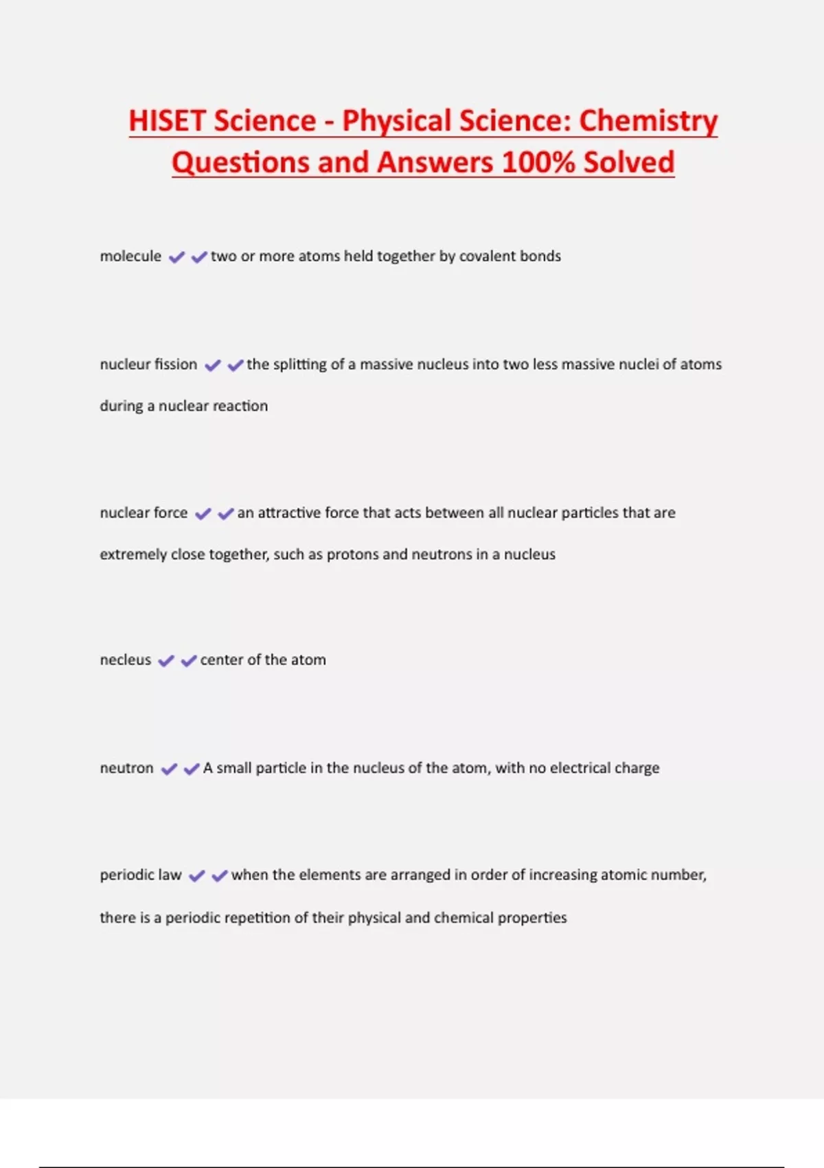 HISET Science - Physical Science: Chemistry Questions and Answers 100% Solved