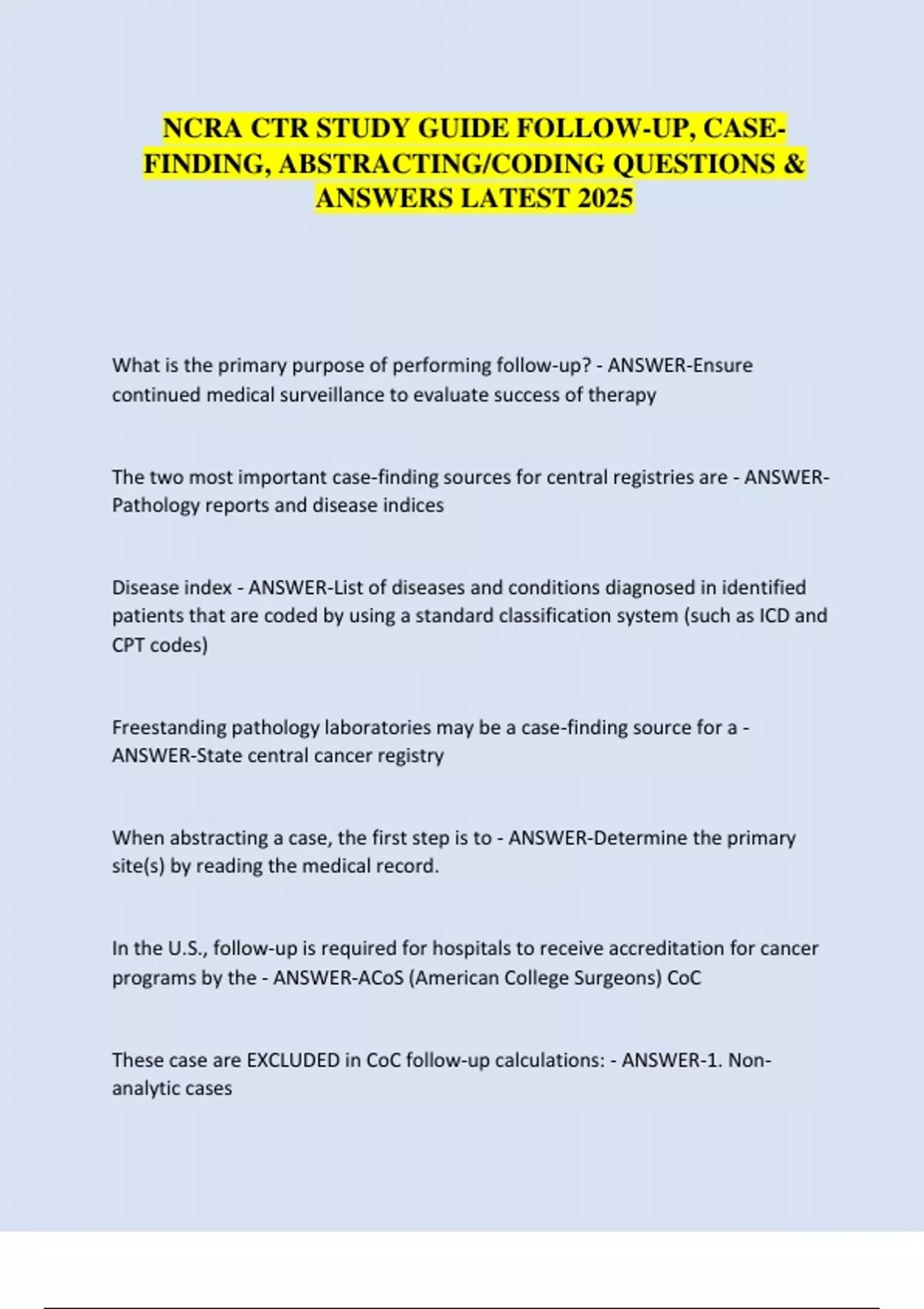 NCRA CTR STUDY GUIDE FOLLOW-UP, CASE FINDING, ABSTRACTING/CODING QUESTIONS & ANSWERS LATEST 2025