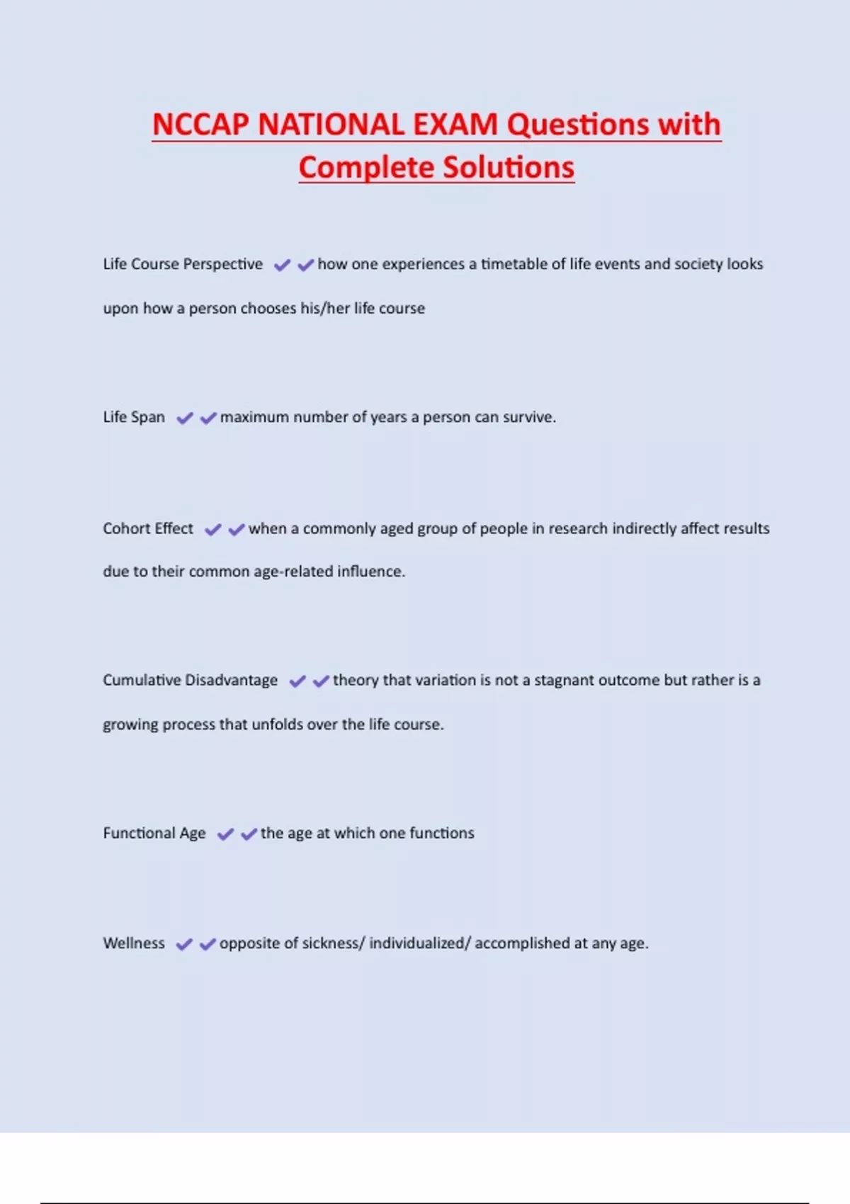 NCCAP NATIONAL EXAM Questions with Complete Solutions Life Course Perspective how one experiences a timetable of life events and society looks upon how a person chooses his/her life course Life Span maximum number of years a person can survive. Cohort Effect when a commonly aged group of people in research indirectly affect results due to their common age-related influence.