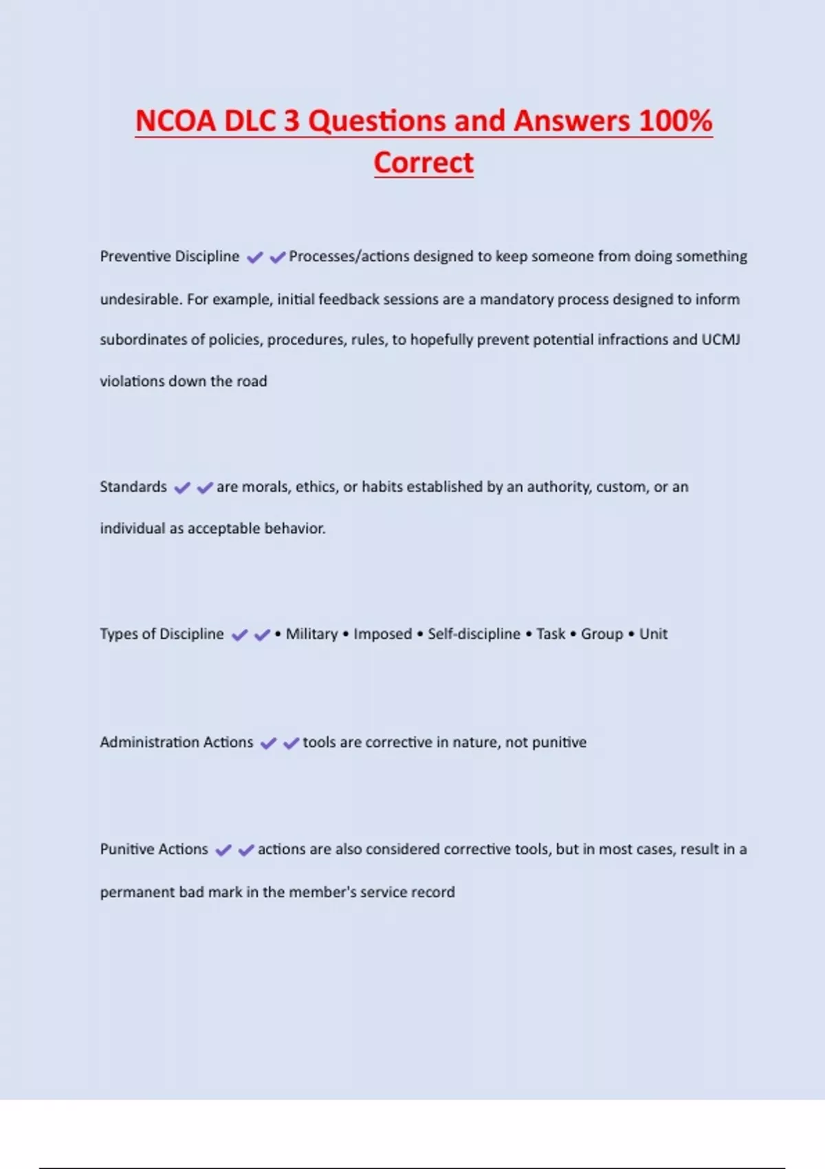 NCOA DLC 3 Questions and Answers 100% Correct Preventive Discipline Processes/actions designed to keep someone from doing something undesirable. For example, initial feedback sessions are a mandatory process designed to inform subordinates of policies, procedures, rules, to hopefully prevent potential infractions and UCMJ violations down the road Standards are morals, ethics, or habits established by an authority, custom, or an individual as acceptable behavior.