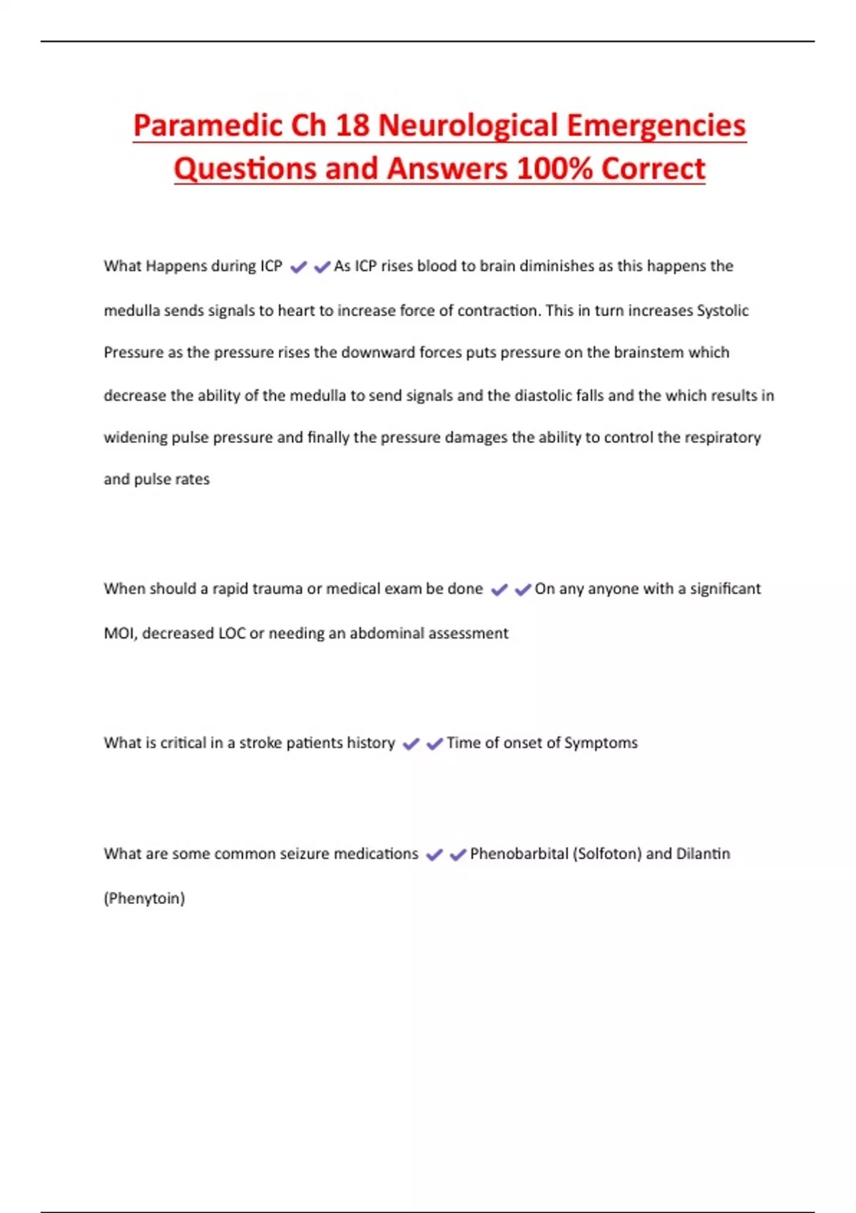 NEUROLOGICAL EMERGENCIES EXAM PACK WITH COMPLETE SOLUTIONS