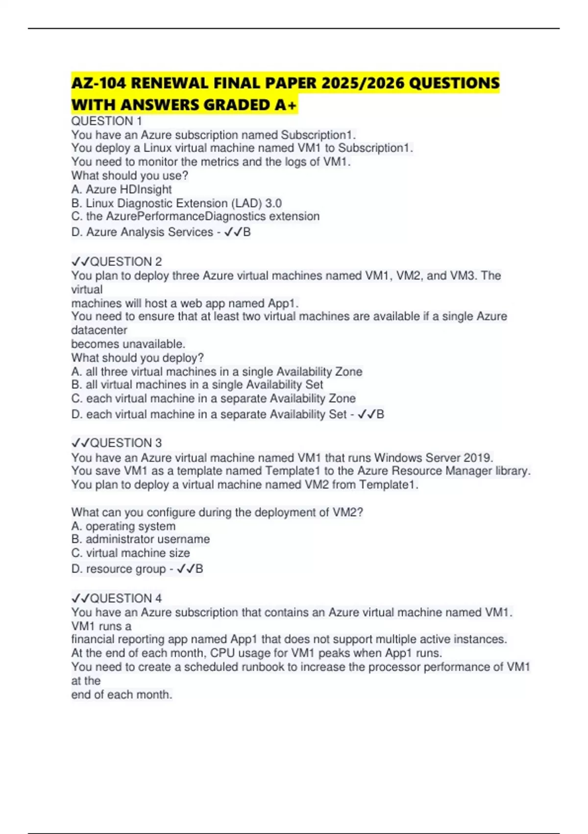 D. each virtual machine in a separate Availability Set - ✔✔B