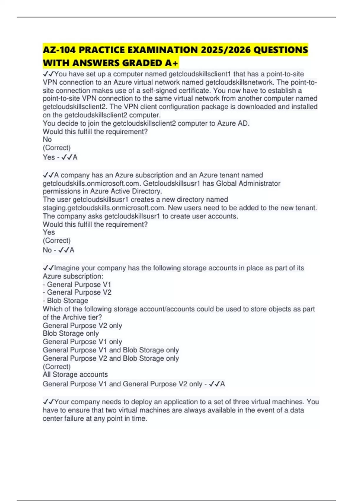 You have set up a computer named getcloudskillsclient1 that has a point-to-site VPN connection to an Azure virtual network named getcloudskillsnetwork. The point-tosite connection makes use of a self-signed certificate. You now have to establish a point-to-site VPN connection to the same virtual network from another computer named getcloudskillsclient2. The VPN client configuration package is downloaded and installed on the getcloudskillsclient2 computer. You decide to join the getcloudskillsclient2 computer to Azure AD. Would this fulfill the requirement? No (Correct) Yes - A A company has an Azure subscription and an Azure tenant named . Getcloudskillsusr1 has Global Administrator permissions in Azure Active Directory. The user getcloudskillsusr1 creates a new directory named . New users need to be added to the new tenant. The company asks getcloudskillsusr1 to create user accounts. Would this fulfill the requirement?