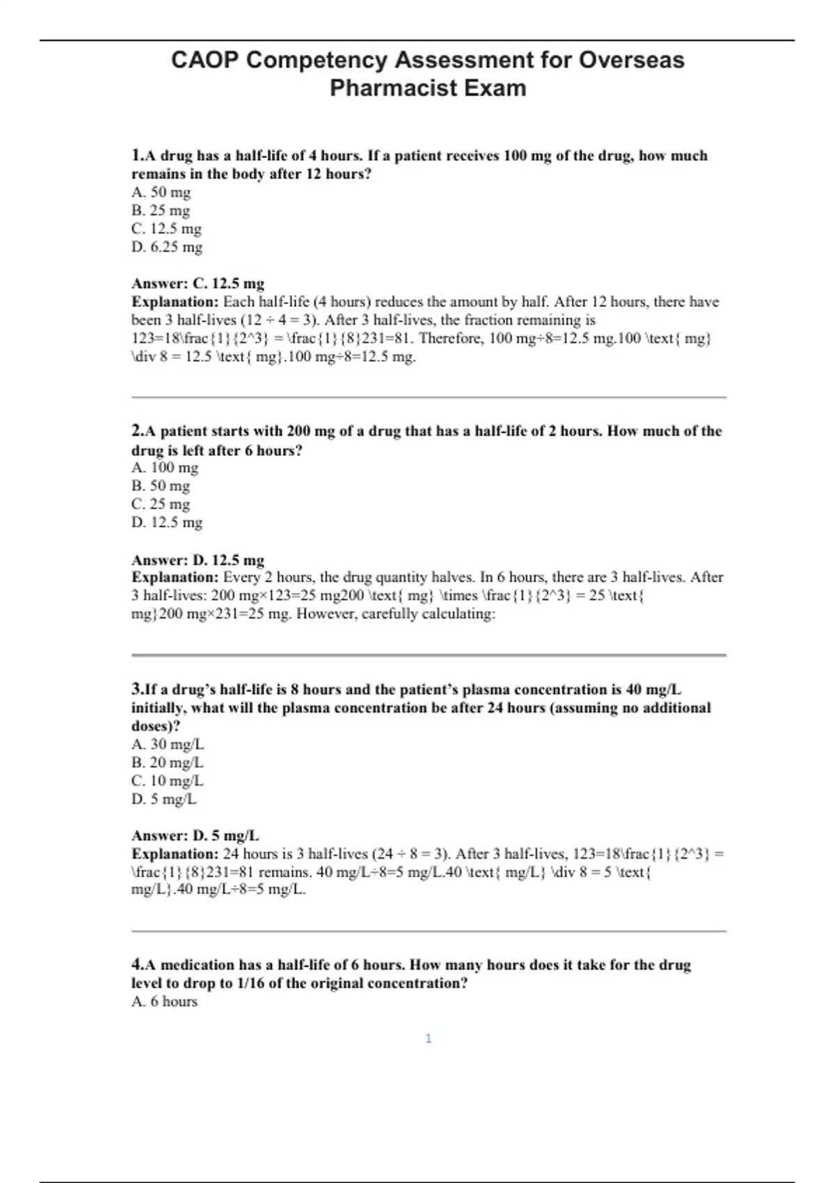 1.A drug has a half-life of 4 hours. If a patient receives 100 mg of the drug, how much