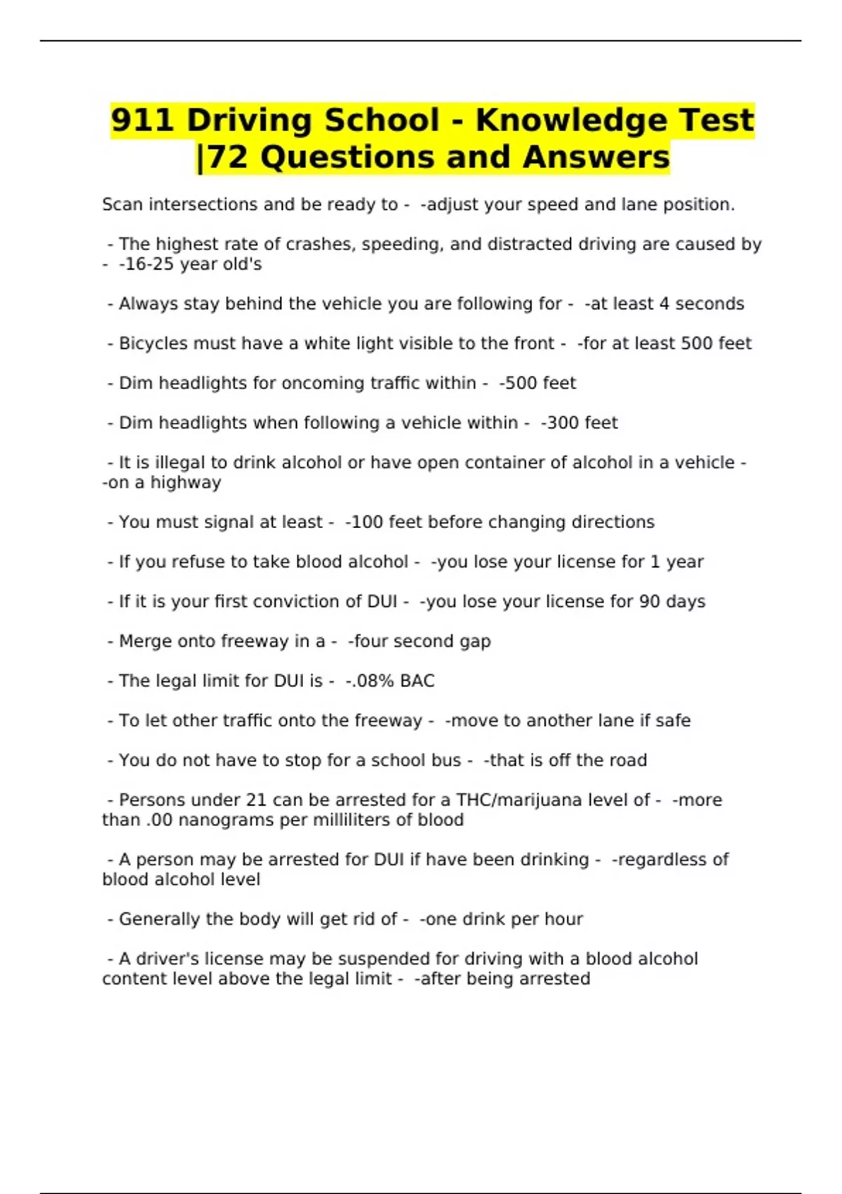 911 Driving School - Knowledge Test |72 Questions and Answers