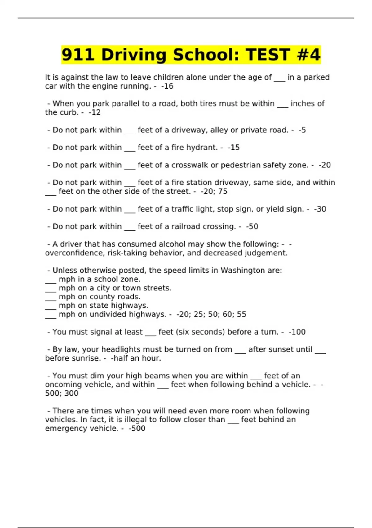 - Do not park within ___ feet of a traffic light, stop sign, or yield sign. - -30