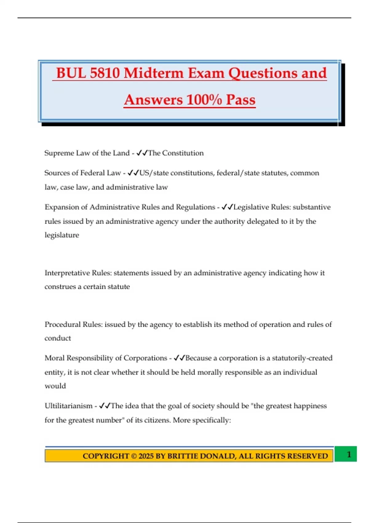 BUL 5810 Midterm Exam Questions and Answers 100% Pass Supreme Law of the Land - The Constitution Sources of Federal Law - US/state constitutions, federal/state statutes, common law, case law, and administrative law Expansion of Administrative Rules and Regulations - Legislative Rules: substantive rules issued by an administrative agency under the authority delegated to it by the legislature Interpretative Rules: statements issued by an administrative agency indicating how it construes a certain statute Procedural Rules: issued by the agency to establish its method of operation and rules of conduct Moral Responsibility of Corporations - Because a corporation is a statutorily-created entity, it is not clear whether it should be held morally responsible as an individual would Ultilitarianism - The idea that the goal of society should be "the greatest happiness for the greatest number" of its citizens. More specifically: 2COPYRIGHT © 2025 BY BRITTIE DONALD, ALL RIGHTS RESERVED Act util.: Assess each separate act according to whether it maximizes pleasure over pain. Rule util.: Support rules that, on balance, produce greatest pleasure for society. Deontology - Actions must be judged by their motives and means as well as their results Ethical Relativism - Actions must be judged by what individuals subjectively feel is right or wrong for themselves; both parties to a disagreement regarding a moral question are correct, because morality is relative Immanuel Kant - For an act to be moral, it must (1) possess the potential to become a consistently-applied law and (2) must respect human beings without treating them as simply a means to an end Legality vs. Ethical - Legal standards are based on written law, wh