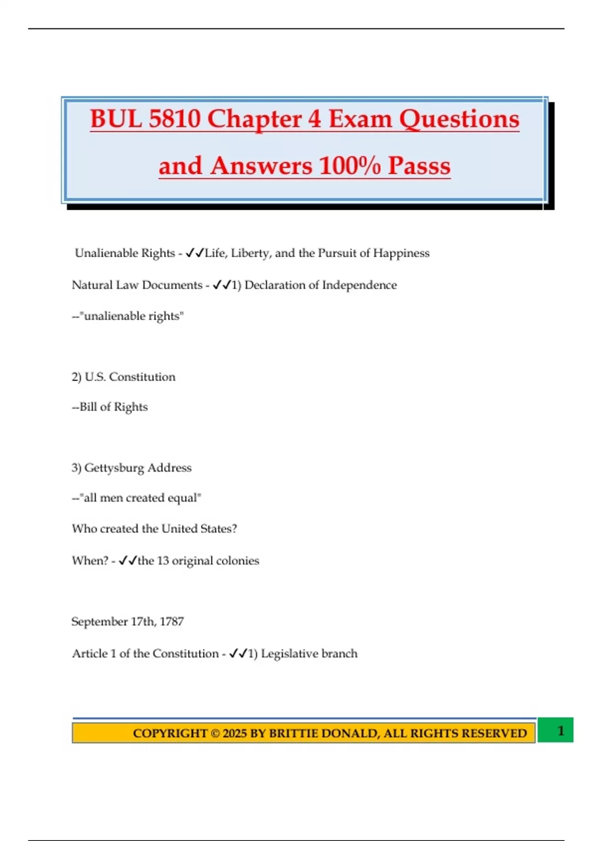 BUL 5810 Chapter 4 Exam Questions and Answers 100% Passs Unalienable Rights - Life, Liberty, and the Pursuit of Happiness Natural Law Documents - 1) Declaration of Independence --"unalienable rights" 2) U.S. Constitution --Bill of Rights 3) Gettysburg Address --"all men created equal" Who created the United States? When? - the 13 original colonies September 17th, 1787 Article 1 of the Constitution - 1) Legislative branch 2COPYRIGHT © 2025 BY BRITTIE DONALD, ALL RIGHTS RESERVED 2) All legislative powers granted should be vested in Congress (Senate and House) 3) Makes the Laws 4) "Power of the Purse" Article 2 of the Constitution - 1) Executive branch 2) All executive powers granted should be vested in the President
