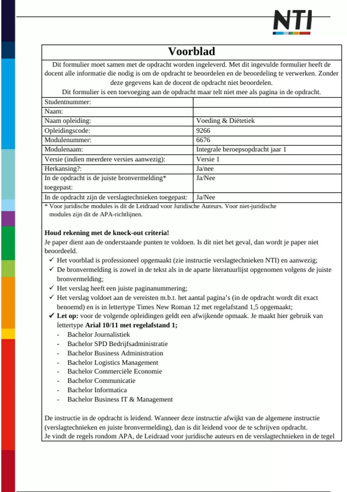Het voorblad is professioneel opgemaakt (zie instructie verslagtechnieken NTI) en aanwezig;