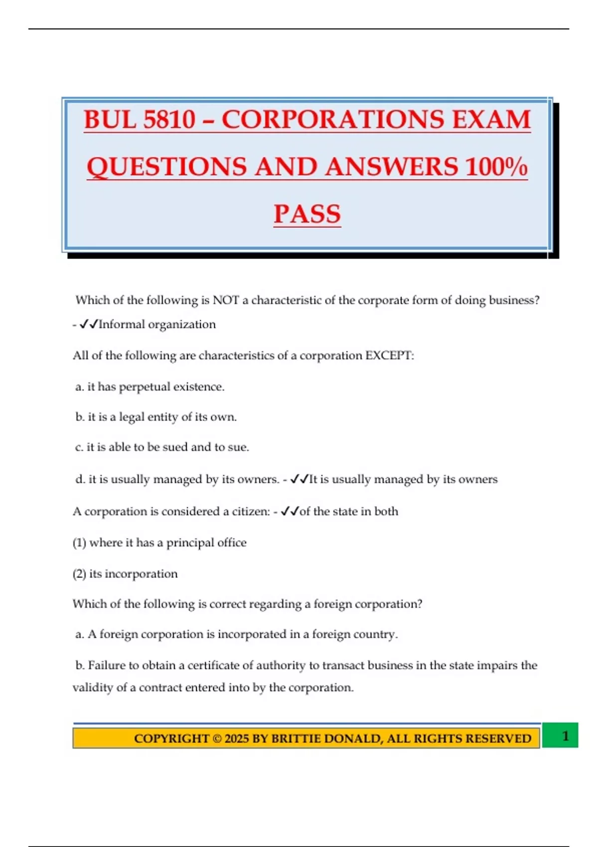 BUL 5810 – CORPORATIONS EXAM QUESTIONS AND ANSWERS 100% PASS Which of the following is NOT a characteristic of the corporate form of doing business? - Informal organization All of the following are characteristics of a corporation EXCEPT: a. it has perpetual existence. b. it is a legal entity of its own. c. it is able to be sued and to sue. d. it is usually managed by its owners. - It is usually managed by its owners A corporation is considered a citizen: - of the state in both (1) where it has a principal office (2) its incorporation Which of the following is correct regarding a foreign corporation? a. A foreign corporation is incorporated in a foreign country. b. Failure to obtain a certificate of authority to transact business in the state impairs the validity of a contract entered into by the corporation. 2COPYRIGHT © 2025 BY BRITTIE DONALD, ALL RIGHTS RESERVED c. A foreign corporation transacting business within a particular state without having first qualified cannot use the state court to maintain a lawsuit until the corporation obtains a certificate of authority. - A foreign corporation transacting business within a particular state without having first qualified cannot use the state court to maintain a lawsuit until the corporation obtains a certificate of authority A promoter of a corporation has a fiduciary duty to: - any other promoters of that corporation The possible consequences of a defective incorporation include all of the following except: a. the state may bring an action against the association for involuntary dissolution. b. the association always being liable for an obligation. c. the associates are held personally liable to a third party.