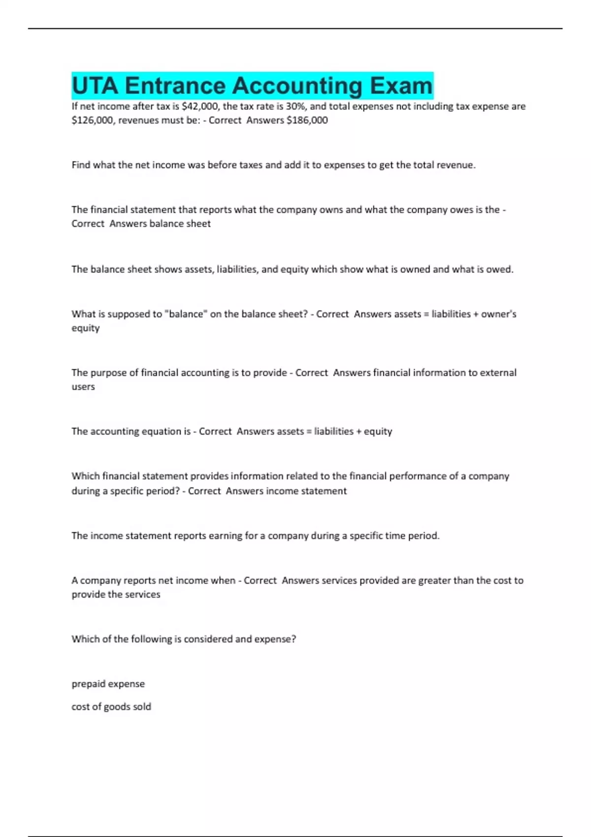 Correct Answers balance sheet