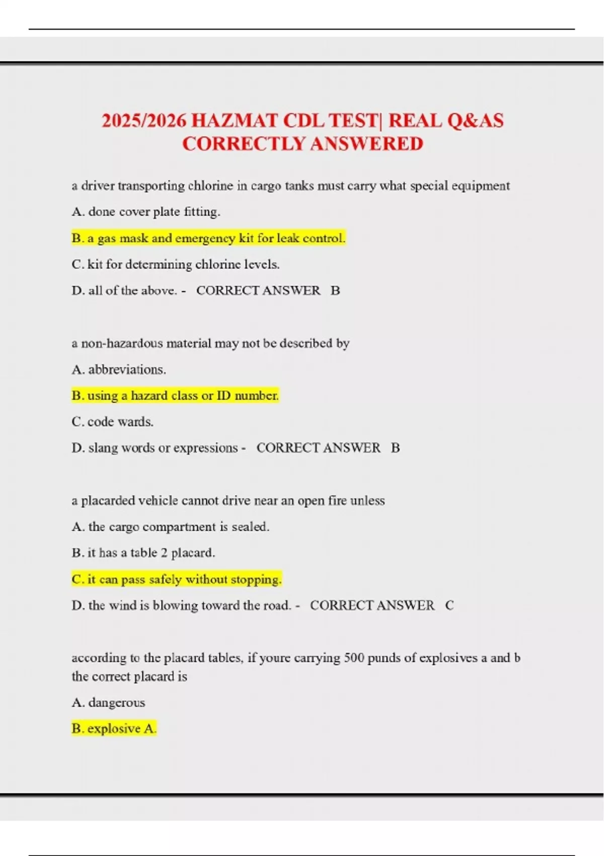 COMPREHENSIVE 2025 HAZMAT CDL TEST REAL Q&AS CORRECTLY ANSWERED