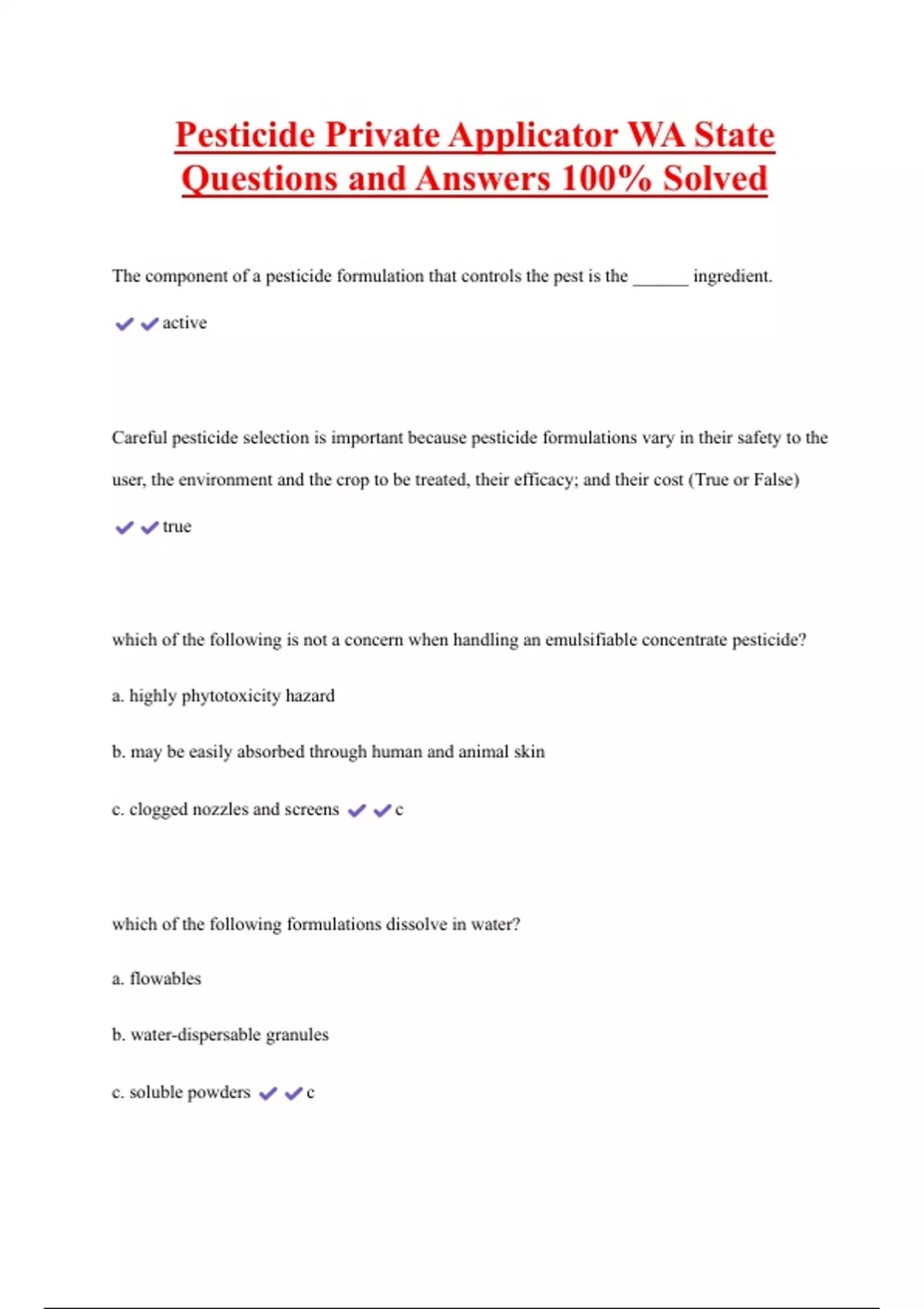 Pesticide Private Applicator WA State Questions and Answers 100% Solved The component of a pesticide formulation that controls the pest is the ______ ingredient. active Careful pesticide selection is important because pesticide formulations vary in their safety to the user, the environment and the crop to be treated, their efficacy; and their cost (True or False) true