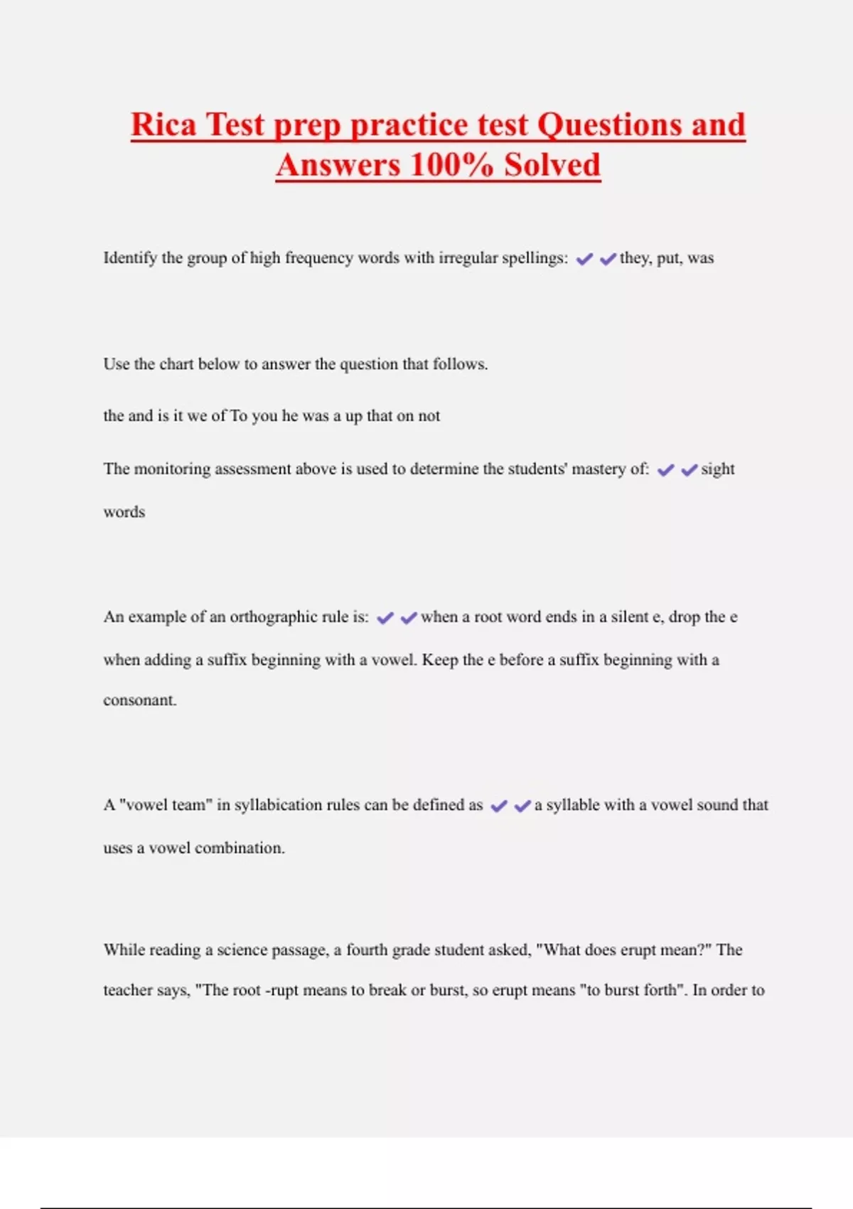 Rica Test prep practice test Questions and Answers 100% Solved Identify the group of high frequency words with irregular spellings: they, put, was Use the chart below to answer the question that follows. the and is it we of To you he was a up that on not The monitoring assessment above is used to determine the students' mastery of: sight words