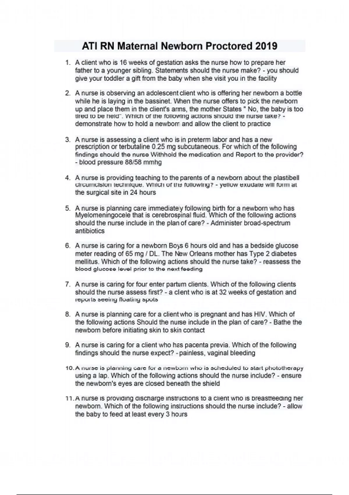 1. A client who is 16 weeks of gestation asks the nurse how to prepare her father to a younger sibling. Statements should the nurse make? - you should give your toddler a gift from the baby when she visit you in the facility 2. A nurse is observing an adolescent client who is offering her newborn a bottle while he is laying in the bassinet. When the nurse offers to pick the newborn up and place them in the client's arms, the mother States " No, the baby is too tired to be held". Which of the following actions should the nurse take? - demonstrate how to hold a newborn and allow the client to practice 3. A nurse is assessing a client who is in preterm labor and has a new prescription or terbutaline 0.25 mg subcutaneous. For which of the following findings should the nurse Withhold the medication and Report to the provider? - blood pressure 88/58 mmhg 4. A nurse is providing teaching to the parents of a newborn about the plastibell circumcision technique. Which of the following? - yellow exudate will form at the surgical site in 24 hours 5. A nurse is planning care immediately following birth for a newborn who has Myelomeningocele that is cerebrospinal fluid. Which of the following actions should the nurse include in the plan of care? - Administer broad-spectrum antibiotics 6. A nurse is caring for a newborn Boys 6 hours old and has a bedside glucose meter reading of 65 mg / DL. The New Orleans mother has Type 2 diabetes mellitus. Which of the following actions should the nurse take? - reassess the blood glucose level prior to the next feeding 7. A nurse is caring for four enter partum clients. Which of the following clients should the nurse assess first? - a client who is at 32 weeks of gestation and reports seeing floating spots 8. A nurse is planning care for a client who is pregnant and has HIV. Which of the following actions Should the nurse include in the plan of care? - Bathe the newborn before initiating skin to skin contact 9. A nurse is caring for a client who has pacenta previa. Which of the following findings should the nurse expect? - painless, vaginal bleeding 10. A nurse is planning care for a newborn who is scheduled to start phototherapy using a lap. Which of the following actions should the nurse include? - ensure the newborn's eyes are closed beneath the shield 11. A nurse is providing discharge instructions to a client who is breastfeeding her newborn. Which of the following instructions should the nurse include? - allow the baby to feed at least every 3 hours 12. A nurse is assessing a client during her first prenatal visit the client reports March 20th us her last menstrual.. Use Niagele's rule to calculate the estimated date of delivery. Use the mmdd format with four numerals and no spaces or punctuation. - 1227 add 7 days, go back/subtract 3 months 13. A nurse is caring for a client who is at 30 weeks of gestation. The nurse should plan to immunize the client which of the following vaccinations? Select all the apply - human papillomavirus Diphtheria - acellular pertussis inactivated influenza 14. A nurse is caring for a client who has preacher labor and receiving magnesium sulfate by continuous IV infusion. Which of the following laboratory values should the nurse review during tocolytic therapy? - Serum medication level 15. A nurse is caring for a client who reports spontaneous rupture. The nurse observed fetal bradycardia in the FHR tracing and notices the umbilical cord is protruding. After calling for assistance and notifying the provider, which of the following should the nurse take next? - Initiate an infusion of IV fluids for the client 16. A nurse is caring for a client who is 36 weeks gestation and has MRSA. Which of the following isolation precautions should the nurse initiate? - Contact 17. A nurse is assessing a client who is 27 weeks of gestation and has pre eclampsia. Which of the following findings should the nurse report to the provider? - Platelet count 60,000/ mm 18. A nurse is providing teaching to a client who is 2 days postpartum And wants to continue using her diaphragm for contraception. Which of the following instruction should the nurse include? - you should keep the diaphragm in place for at least 4 hours after intercourse 19. A nurse is caring for a client who is receiving prenatal care and is at her 24- week appointment. Which of the following laboratory tests should the nurse plan to conduct? - blood type and Rh 20. A nurse is caring for a client who has gestational diabetes mellitus. Which of the following clinical findings should indicate to the nurse the client has hyperglycemia? - increased urination 21. A nurse is reviewing the laboratory results of a newborn. Which of the following findings should the nurse report to the provider? - platelets 100,000/ mm 3