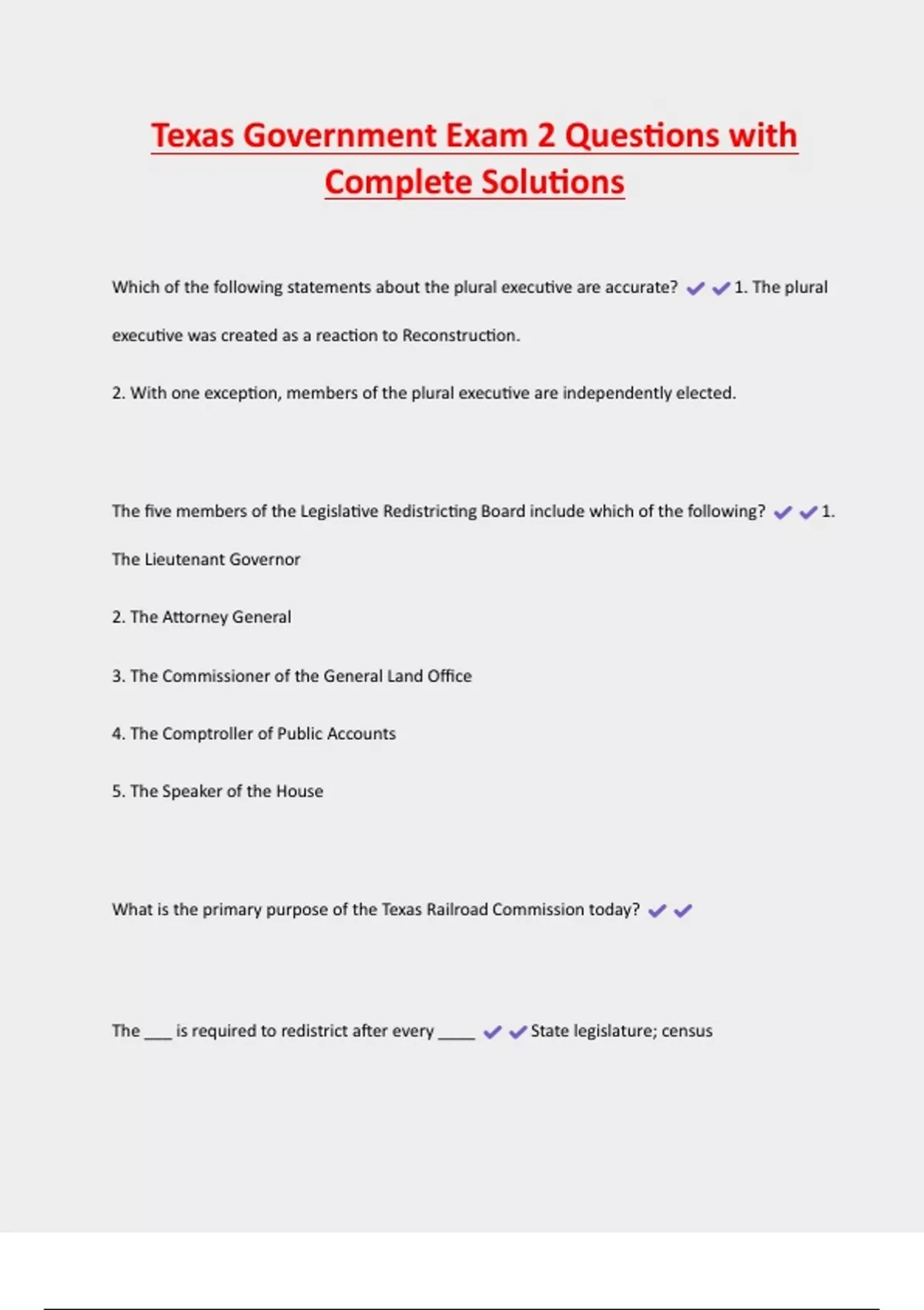Texas Government Exam 2 Questions with Complete Solutions Which of the following statements about the plural executive are accurate? 1. The plural executive was created as a reaction to Reconstruction. 2. With one exception, members of the plural executive are independently elected. The five members of the Legislative Redistricting Board include which of the following? 1. The Lieutenant Governor 2. The Attorney General 3. The Commissioner of the General Land Office 4. The Comptroller of Public Accounts 5. The Speaker of the House