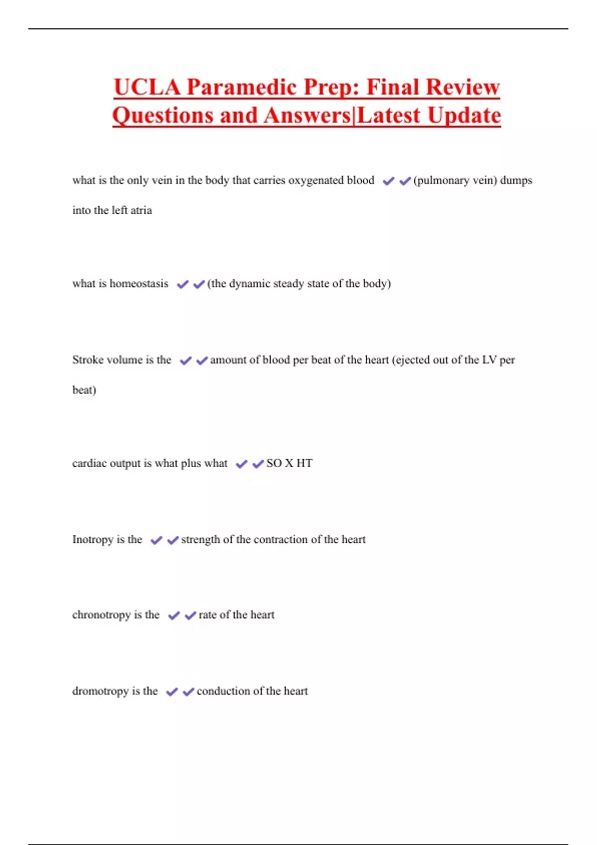 UCLA Paramedic Prep: Final Review Questions and Answers|Latest Update what is the only vein in the body that carries oxygenated blood (pulmonary vein) dumps into the left atria what is homeostasis (the dynamic steady state of the body) Stroke volume is the amount of blood per beat of the heart (ejected out of the LV per beat)