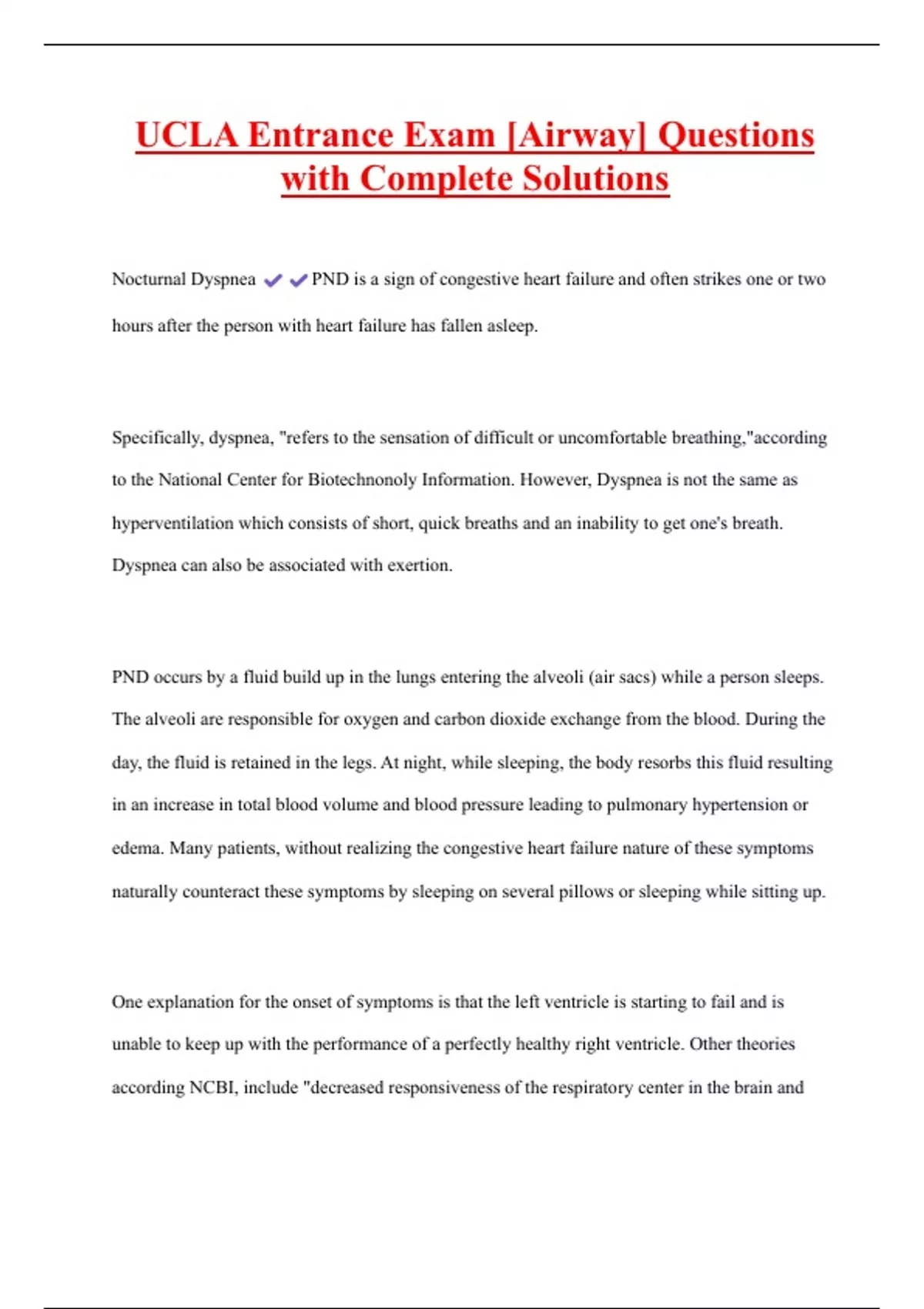UCLA Entrance Exam [Airway] Questions with Complete Solutions Nocturnal Dyspnea PND is a sign of congestive heart failure and often strikes one or two hours after the person with heart failure has fallen asleep. Specifically, dyspnea, "refers to the sensation of difficult or uncomfortable breathing,"according to the National Center for Biotechnonoly Information. However, Dyspnea is not the same as hyperventilation which consists of short, quick breaths and an inability to get one's breath. Dyspnea can also be associated with exertion.