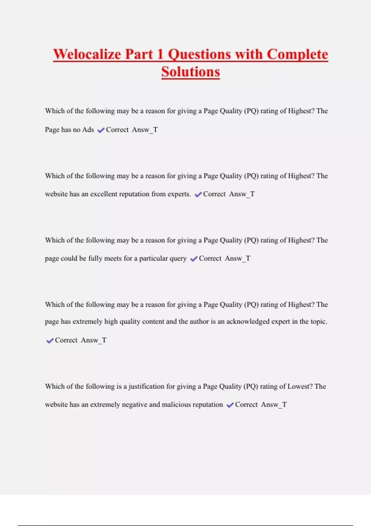 Welocalize Part 1 Questions with Complete Solutions Which of the following may be a reason for giving a Page Quality (PQ) rating of Highest? The Page has no Ads Correct Answ_T Which of the following may be a reason for giving a Page Quality (PQ) rating of Highest? The website has an excellent reputation from experts. Correct Answ_T Which of the following may be a reason for giving a Page Quality (PQ) rating of Highest? The page could be fully meets for a particular query Correct Answ_T